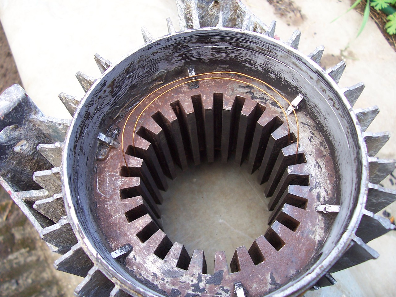 2db 0,54 huzal van párhuzamosan tekerve a menetszám 76, de egy horonyban 2 tekercs van és ilyen körkörösen haladt, sajnos nem tudtam, úgy lebontani, hogy a kötéseket is meg tudjam figyelni. A 76-os menetszám a 2db párhuzamosan összefogott vezetékre vonatkozik. Egy tekercs között 9 horony van (azaz ha beszámítom azt a hornyot is amiben a tekercs is benne van akkor 11 hornyot fog közre).