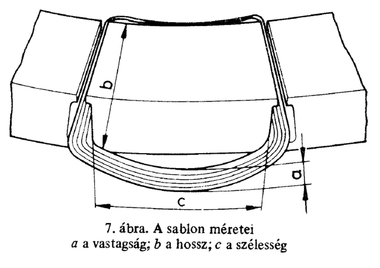 A méretvételnél a huzallal sugár irányba indulunk, amíg teljesen ki nem kerüljük a mellette levő hornyot és ekkor kb. 5-6mm -rel a vastesttől elindulunk a másik tekercsláb helyére és ott ugyanilyen geometriával megyünk a horonyba. Mindkét oldalon ilyen legyen, aztán, ha összekötöttük a drótvéget, kivéve kifeszítjük újra, hogy a horonyban egyenesen feküdjön a méretvevő szál és újra berakjuk, meghajtjuk a kilépéseknél és finomítunk, ha kell.