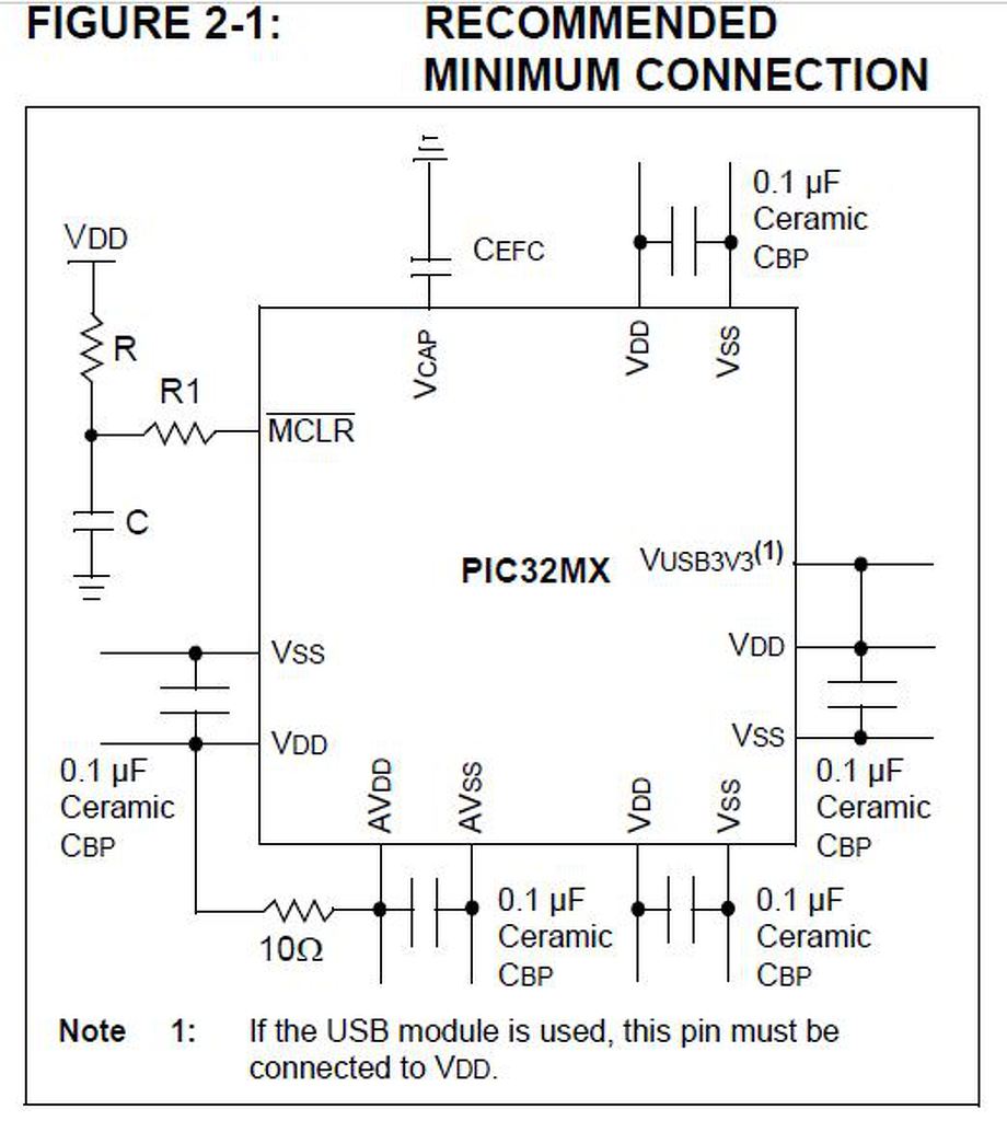 55 - VUSB_3v3 : Az USB busz meghajtóinak tápfeszültsége. 51 -USBID : Az USB modul képes a host és a device funkciókat is ellátni sőt váltani közöttük (USB On The Go). Az USBID lábat a mini / mikro USB csatlakozó megfelelő lábára kötve lehet érzékelni, hogy milyen kábelt csatlakoztattak, így el elhet dönteni, hogy a PIC host vagy device legyen. Idézet: „...szűrve egy 100nF-os kondival...” Nézd meg a tápszűrési ajánlást az adatlapban. Egy 100nF nem lesz elég. Több karámia kondenzátort kell párhuzamosan kötni : 100n // 10 n, de egy-két helyen 10u // 100n // 1n Minden táp lábhoz kell egy ilyen csomag, max. 6 mm -re a lábaktól.