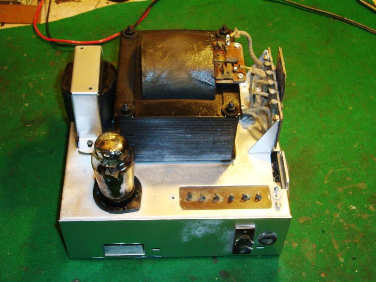 Foytatom a tápegységet: csak a fojtó tafót szedtem le róla, aztán először kitakartam mindent, és csak a hál. trafót fújtam le feketére, majd száradás után a többi részt maszkoltam ki, és lefújtam ezüsttel. Műszakilag jó volt, csak a két elkót kellett cserélni benne. Érdekesség, hogy 4 elkó adja a szűrést, amiből kettő eredeti 30-as évekből való Siemens, annak semmi baja, a másik kettő viszont később berakott, cserélt Tesla volt, azok persze halottak. Most ez is késznek mondható, holnap megpróbálom összekötni és megszólaltatni a gépet.