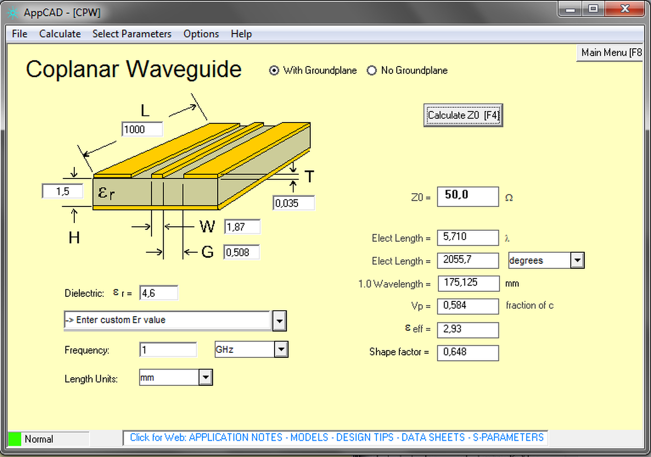 Az AppCad-ba a felső fémezés vastagságára írj be pl T=0.0001 értéket és a két eredmény azonos lesz. A másik kalkulátor nulla vastagsággal számol.