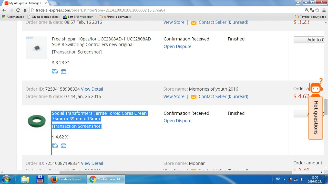 Szia! Lehet, hogy kifogtál egy hamis garnitúrát! 12V->230V-os DC-AC inverterhez még jó lehet. Inkább a magyar gazdaságot támogatnám én is, de a kínai árak verhetetlenek. Majd ha a nyugat európai bérek begyűrűznek hazánkba akkor én is itthon vásárolok. HGTG30N60A4D vettem 1500Ft-ért 10db-ot, nincs vele semmi gond. A vásárlásaim száma 40 felett van, egyik sem haladja meg az egyenkénti 10 dollárt. Eddig az összes termékkel meg vagyok elégedve. Persze drága mobilt nem innét vennék. A wireless egértől gezdve, az ezüst gyűrű, léptetőmotor vezérlő, OBDII diagnosztikai csatlakozó, stb mindenféle kütyü. Én kikeresem a legolcsóbb árat az ali-n, és megnézem az eladó értékelését, ha már évek óta árul és minimális a negatív értékelések száma, akkor vásárolok. Persze lehet pl: HGTG30N60A4D venni 10 dollárért darabját, csak semmi garancia nincs rá, hogy nem hamisítvány az is. Sőt nemrég rendeltem 2db nagyobb méretű zöld ferrit gyűrűt. Három nap múlva az eladó küldött egy e-mail-t, hogy sajnos a vámon kibontották és újra kell küldenie. Fényképpel is igazolta. Türelmemet kérte és ajándékot is ígért. Gondoltam miféle ajándékot küldhetne? Majd megérkezett a csomag, 2 helyett 4db gyűrű + 6db kisebb szintén zöld gyűrű, Al=6900 körül. Most ezeket használom gate trafónak, valamint áramváltónak. Ezek után semmi rosszat nem tudok róluk mondani. Persze sokaknak nincs ilyen jó tapasztalatuk. Szerintem ennyi kockázat belefér. UCC2808 smd ic-ét is innét vettem 10db-ot, a Lomexben jó esetben 1db-ot tudnék venni, ennyi pénzért. A második gépemben az egyik üzemel, hónapok óta. Most készítem a harmadik invertert amibe egérmozit is tervezek, szinte minden kínából származik még az smd ellenállások is, kivéve a PIC-et. Apropó az első masinánál a harmadik UCC3808 dip tokos ic lett jó, amiket 1200Ft-ért vásároltam db-át, hazai elektronikai üzletekből. Két ic csak úgy tönkre ment. Szekunder diódának a BYV-200 nekem nagyon beváltak, kb: ugyan annyit tud mint az APU diódák, és valamivel még olcsóbb is.