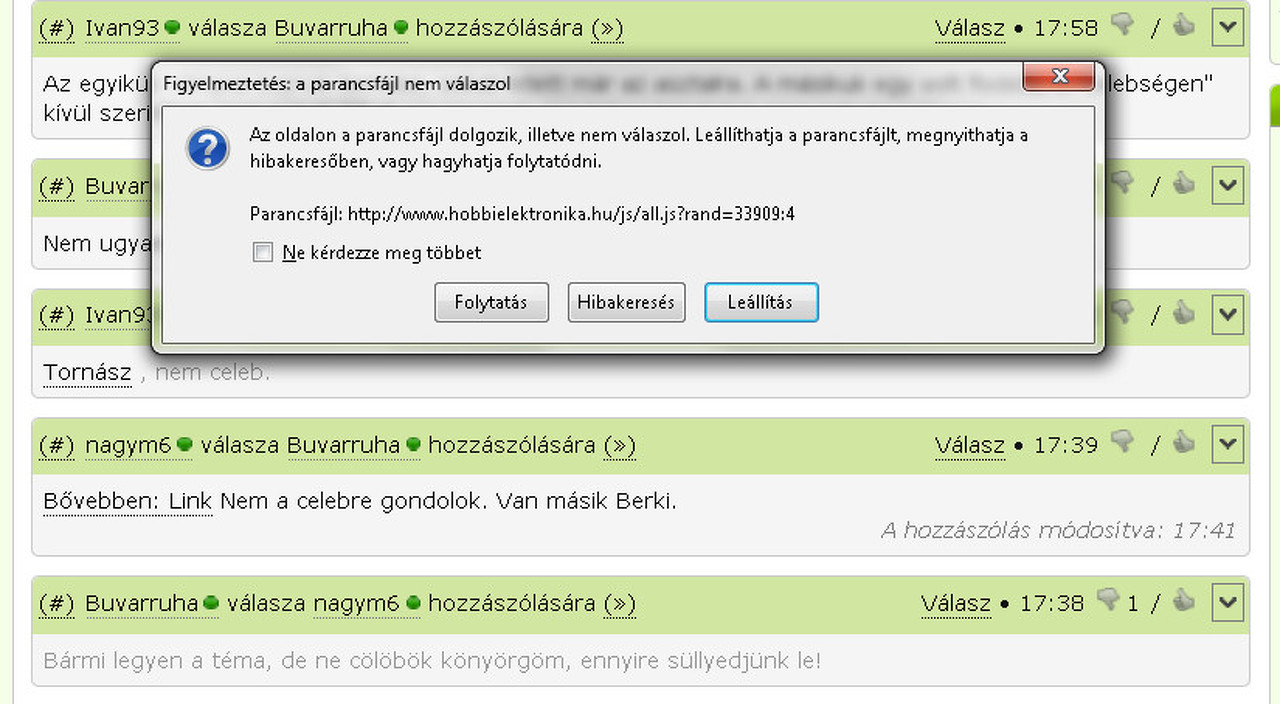 Bugreport: Megpróbáltam leszavazni a saját hozzászólásomat, erre meghal a böngésző. Mindenki másét le tudom szavazni, de a sajátomnál bugzik az oldal.