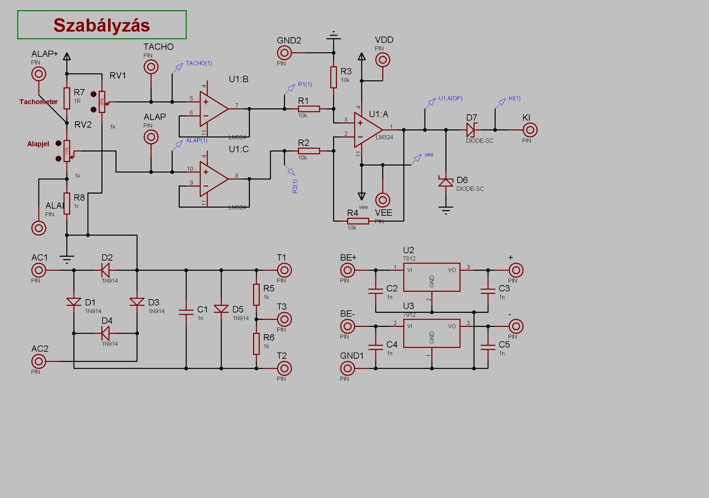 Ha a kapcsolást csak úgy használod ahogy a rajzon van, akkor a P3-mal beállítod a fordulatszámot, üresjáratban, de amikor odatolod neki a szerszámot, akkor a fordulatszám leesik. Célszerű tehát a fordulatszám leesésekor gázt adni. Igen, ezt egy fordulatszámmérő figyelné, a mellékletben mutatottak szerint. Ez csak egy különbségképző, ami a fordulatszám és az alapjel különbségét képezi, de figyelembe kell venni az előjeleket, mert a fázishasító itt fordítva működik, kis feszültségre állít nagy teljesítményt. Az inverter elhagyásával és az utolsó OPA bemeneteinek felcserélésével valószínűleg meg lehet fordítani és ezzel egyszerűbbé is válik a kapcsolás. Ezt nem próbáltam ki. A szabályzást kipróbáltam, nagyszerűen tartja is a fordulatszámot, de azt egész alacsonyra nem tudtam levinni, hogy miért azt nem tudom. Az én esetemben, ami egy mosógépmotor volt a tachométer AC-t adott annk az egyenirányítóját láthatod a rajz bal alsó részénél, max 12V-os fordulatszámot céloztam meg, ott határoltam, hogy a tápnál nagyobb ne legyen. Ja az RV1 csak a tacho jelének a szimulálására van ott, a valóságban az egyenirányító feszültsége van azon a ponton.