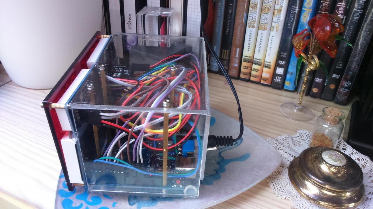 . A hátlapon található kapcsoló nem a tápfeszültséget kapcsolja, lefelé kapcsolt állásában tudom programozni az Arduinot, mert a nagy kijelző meghajtására kellett használnom az RX/TX párost, és ha ezek nem szabadok, a program nem tölthető fel az eszközre. Tudom, hogy nagyon kábeldzsumbuj, de pont az volt a cél, hogy bele lehetne látni, és jobbára kisfiammal készült, csak össze kellett dugdosni a dolgokat, kivéve a hét napját kijelző LED-eket tartalmazó panelt (ez látható az elölről készült vakus képen),és a demultiplexer paneljét.