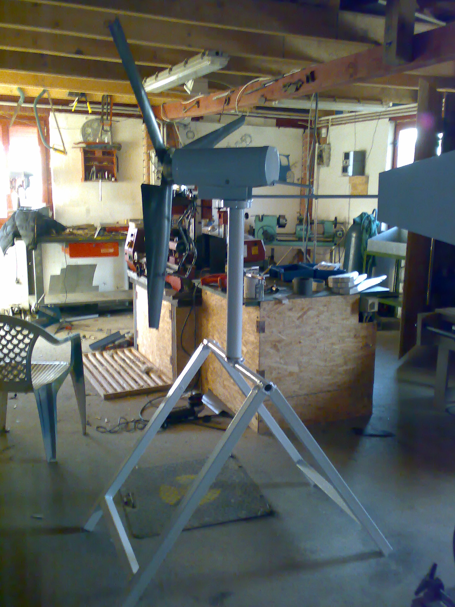 az első ötletem, egy fa szélkerék volt..meg is csináltam szépen, kifaragtam, ahogy tudtam. ráraktam a gépre, de megsem mozditotta. végső elkeseredésemben gyorsan szereztem egy műanyag csövet, és kivágtam ezeket a lapátokat cirka fél ora alatt. ahogy felraktam, már kicsavarta a kezemből a szél.. már beterveztem, hogy szerzerk vastagabb falú csövet, és ujracsinálom a lapátokat, nehogy a nyári melegben elhajoljon, és beleérjen a tartooszlopba.