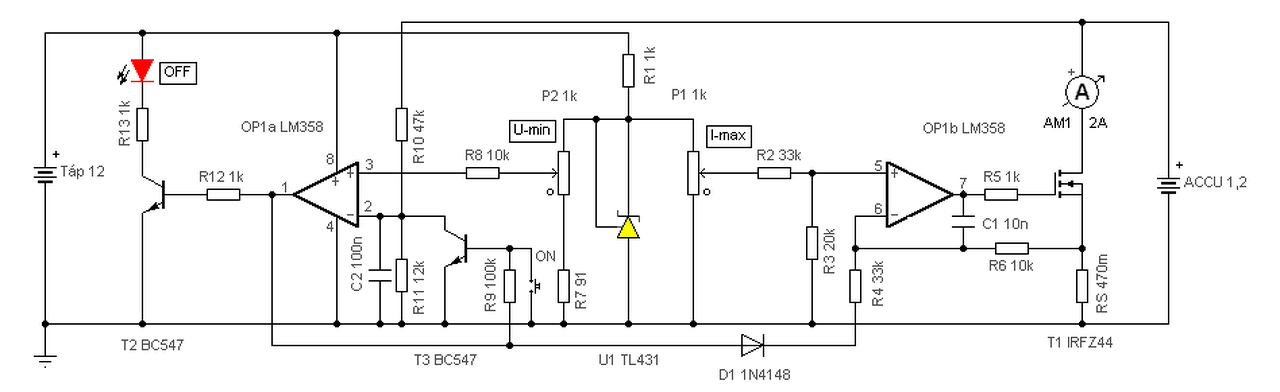 Hello! Lerajzoltam kb. amit szeretnél. De cseppet tovább is gondoltam, mert úgy vélem, aksikat szeretnél vele kisütni. Így tartalmaz egy lekapcsoló áramkört is, ami ha a beállított térték alá süllyed a feszültség, kikapcsolja a kisütőáramot. Ha ez nem kell, a baloldali részt elhagyod. Nagyobb áram esetén keményebb Fet-et kell választani, és kisebb RS ellenállást..