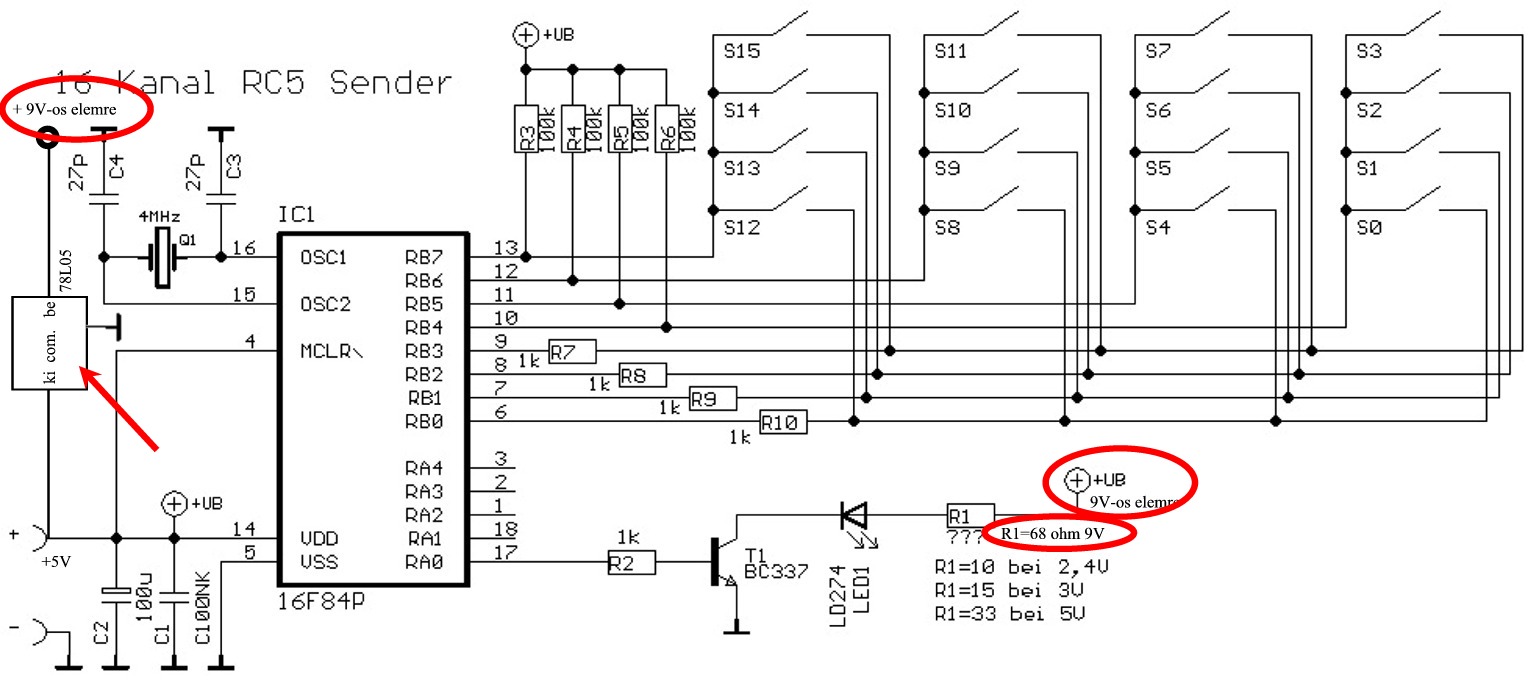 +5V-ot a stab ic-n keresztül kap a kontroller, egyébként a led 9V-ra megy előtét ellenálláson keresztül. Ez a kapcsolási rajzból elég egyértelműen kiderül...