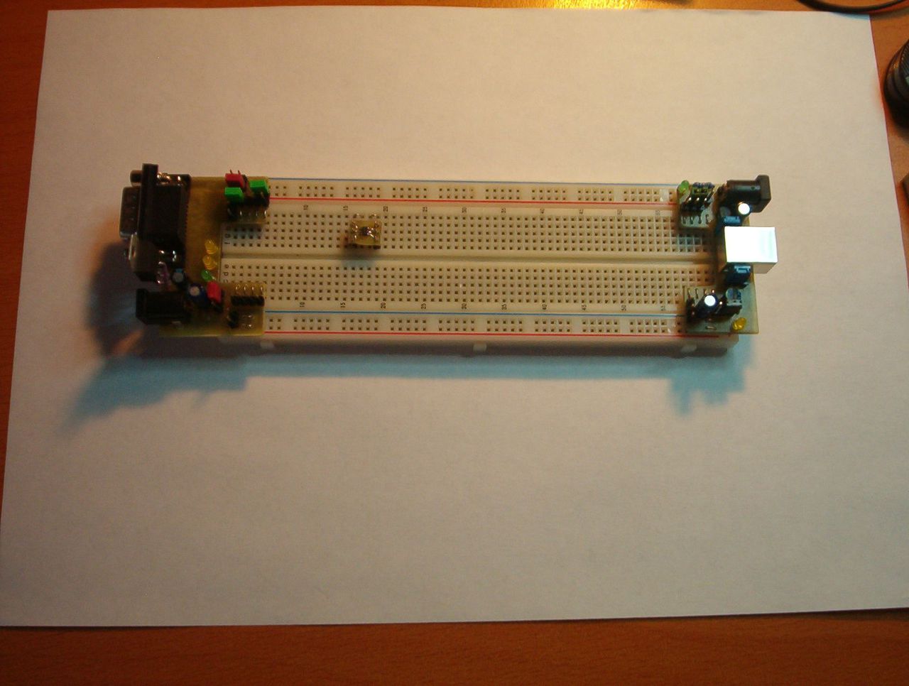 A bal oldali pedig az UART -os kísérletezéshez nyújt segítséget. Egy SMD MAX2323 szintillesztő van a DB9 és a panel között.