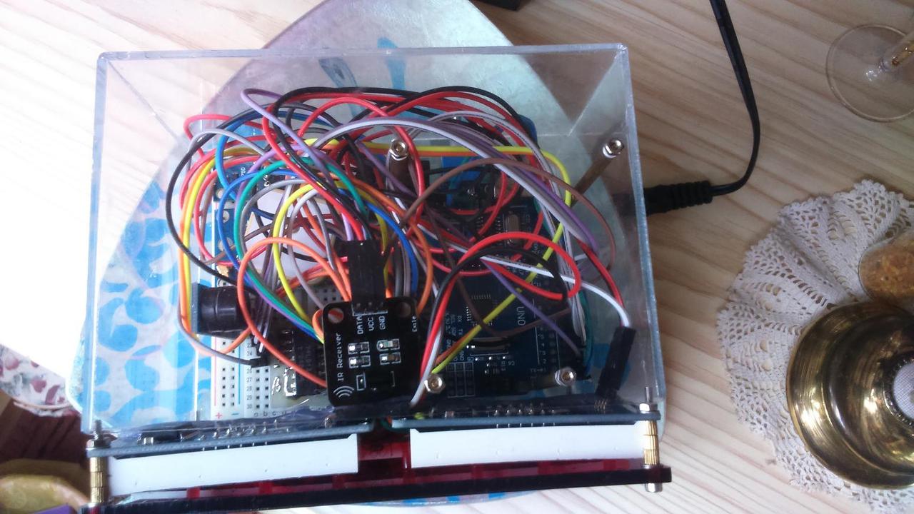 Elkészült Arduino alapú GPS-vezérelt órám. Az idő kijelzésén kívül ébreszt (pittyegéssel, mert a piezo dallamkeltését förtelmesnek találtam... ), automatikusan átáll a téli-nyári időszámításra, a dátumkijelzőjében változtatható, milyen sorrendben jeleníti meg az adatokat, az időzóna is változtatható, amiben működik (a programjában a CET az6 alapértelmezett jelenleg), és mindezt infra távirányítóval tudom vezérelni. A kijelzők fényereje alkalmazkodik a környezeti megvilágításhoz, és van egy standby (éjszakai) üzemmódja is, mert a feleségemet zavarta, hogy annyi minden világít, ekkor csak az órát, percet jelzi ki. Amihez saját elektronikát kellett építeni, az a hét napjának kijelzése, ami 7 db LED-del történik a dátum alatti sorban (a képeken épp hétfő van, a feliratozás még nincs kész, azt még ki kell találnom). Ezeknek a meghajtását egy demultiplexerrel oldottam meg, mert nem volt már elég digitális kimenetem . A hátlapon található kapcsoló nem a tápfeszültséget kapcsolja, lefelé kapcsolt állásában tudom programozni az Arduinot, mert a nagy kijelző meghajtására kellett használnom az RX/TX párost, és ha ezek nem szabadok, a program nem tölthető fel az eszközre. Tudom, hogy nagyon kábeldzsumbuj, de pont az volt a cél, hogy bele lehetne látni, és jobbára kisfiammal készült, csak össze kellett dugdosni a dolgokat, kivéve a hét napját kijelző LED-eket tartalmazó panelt (ez látható az elölről készült vakus képen),és a demultiplexer paneljét.