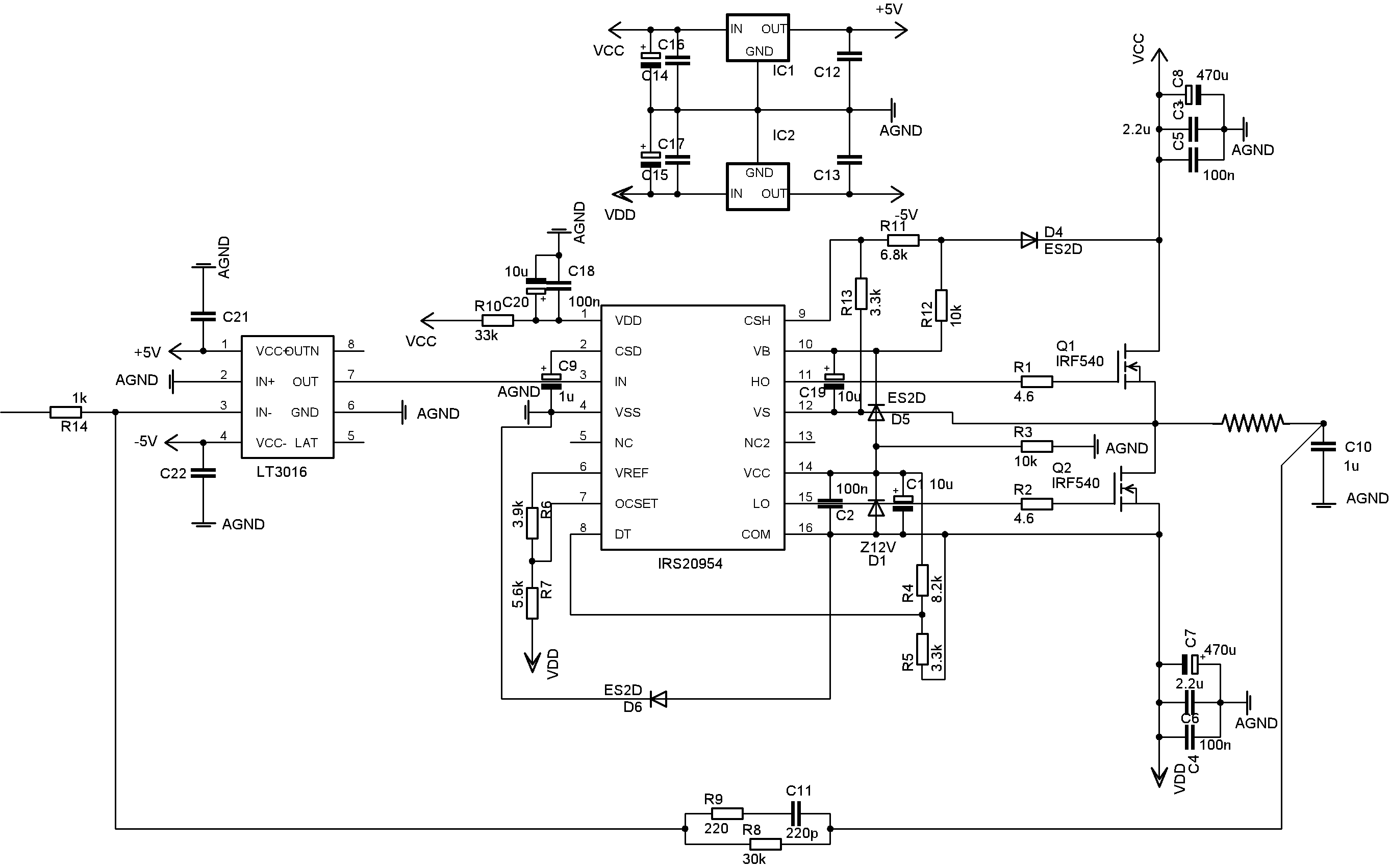 Az adott fetekkel ennél is +-45Vig lehet elmenni, ami kb 150W 4 ohmos terhelésre. UcD-ből millio variáciot lehet találni a neten. a Diyaudio.com-on, de van egy forum a terminal.hu-n is ahol PWM erősítőkről van szó, és ott több hozzáértő ember szol a témához. mostanság sajnos elég kihalt, de ha visszalapozol nagyon sok minden van benne. (a csatolt rajzon az UcDben használhatsz pl IRF3315, vagy IRF540N stb hasonlo FETeket)