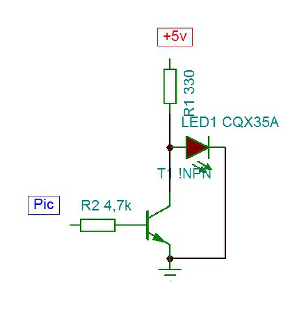 PIC kimenetén levő alcsony szintnél világító LED: PIC kimenet - áramkorlátozó ellenállás - (K) LED (A) - Vdd