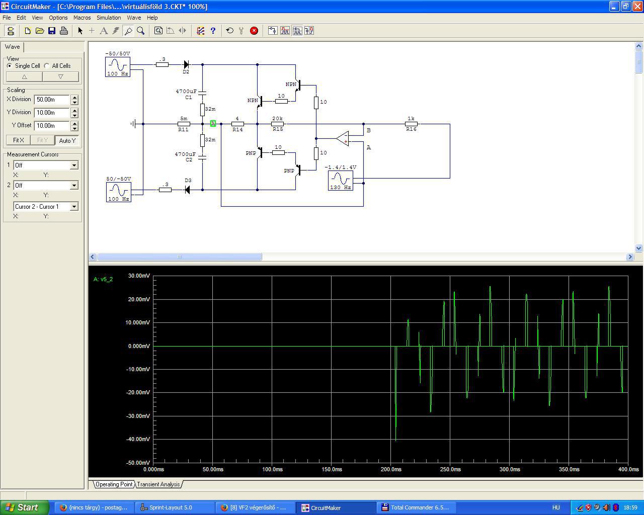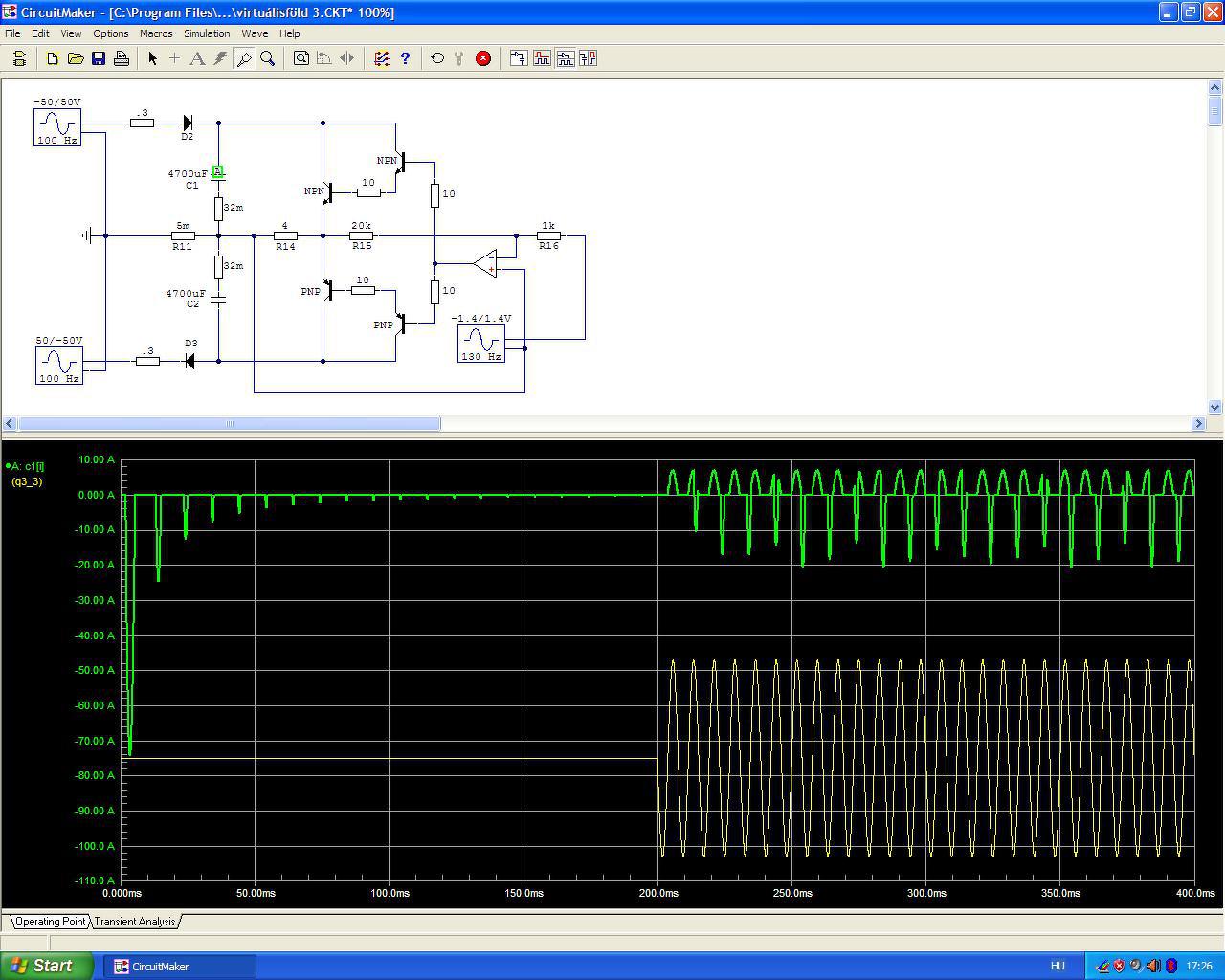 Újra elküldöm a tegnapi szimulációt a pufferkondin átfolyó áramról. Ez az áram az 5mOhm-os földfólián (R11) 40mV zavarjelet is kelthet, ami ekkora kimeneti feszültségnél 0.15%-os torzítást jelentene a kimeneten. De ez a jel együtt lebeg a jelfölddel. A végfok mindkét bemenetén ("A" és "B" pontokon egyaránt) és az összes többi földponton megjelenik, így végfok "nem látja" azt. Nem erősíti fel és a kimenetén csak a generátor tiszta szinuszos jele mérhető.