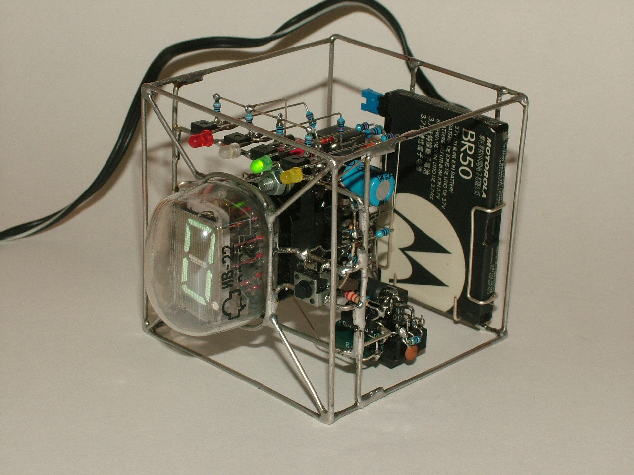Sikerült szereznem három homlok-kijelzős IV-22-es VFD csövet, és a meccsek szüneteiben összedrótoztam egy másik "Küklopsz csontváz" órát. Ennek a programjában nincsen csengető, a digitek helyi-értékét jelzi ki LED-ekkel. A mérete k.b. egy Rubik kocka mérete 6x6x6 cm. A kapcsolás, és a program itt található: http://www.electronixandmore.com/projects/vfdclock/index.html Én két MC34063-al megépített kapcsoló üzemű tápról (1.25V és 14V), és egy 78L05 stabilizátor (PIC) járatom egy dugasztápról. Hálózatkimaradásnál a telefon aksiról megy a PIC. Küldök közös "csoportképet" a nagyobbik testvérével is. Szép napot kívánok! István