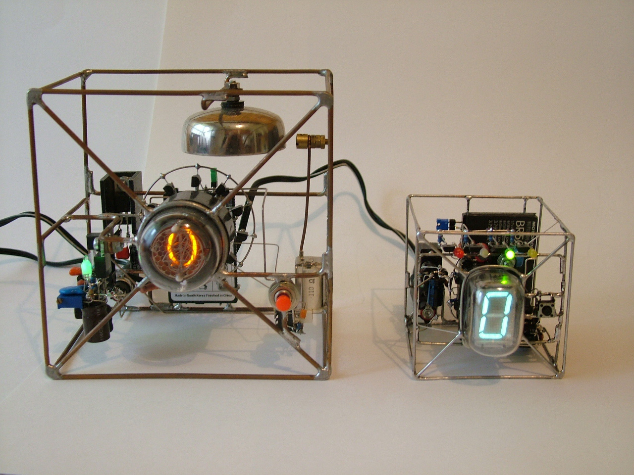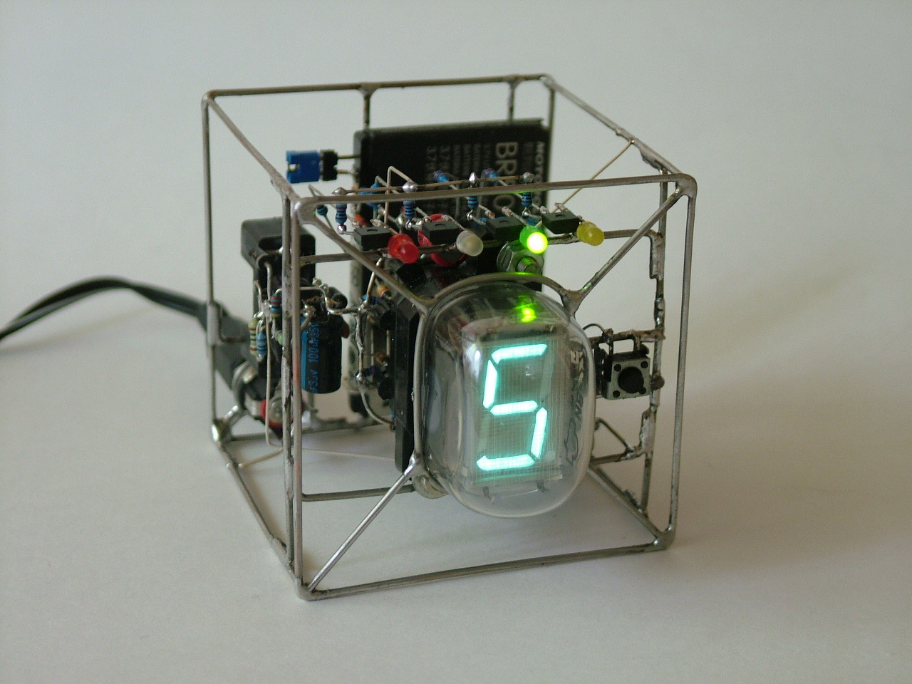 Sikerült szereznem három homlok-kijelzős IV-22-es VFD csövet, és a meccsek szüneteiben összedrótoztam egy másik "Küklopsz csontváz" órát. Ennek a programjában nincsen csengető, a digitek helyi-értékét jelzi ki LED-ekkel. A mérete k.b. egy Rubik kocka mérete 6x6x6 cm. A kapcsolás, és a program itt található: http://www.electronixandmore.com/projects/vfdclock/index.html Én két MC34063-al megépített kapcsoló üzemű tápról (1.25V és 14V), és egy 78L05 stabilizátor (PIC) járatom egy dugasztápról. Hálózatkimaradásnál a telefon aksiról megy a PIC. Küldök közös "csoportképet" a nagyobbik testvérével is. Szép napot kívánok! István