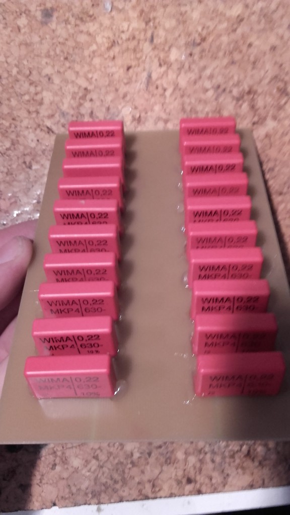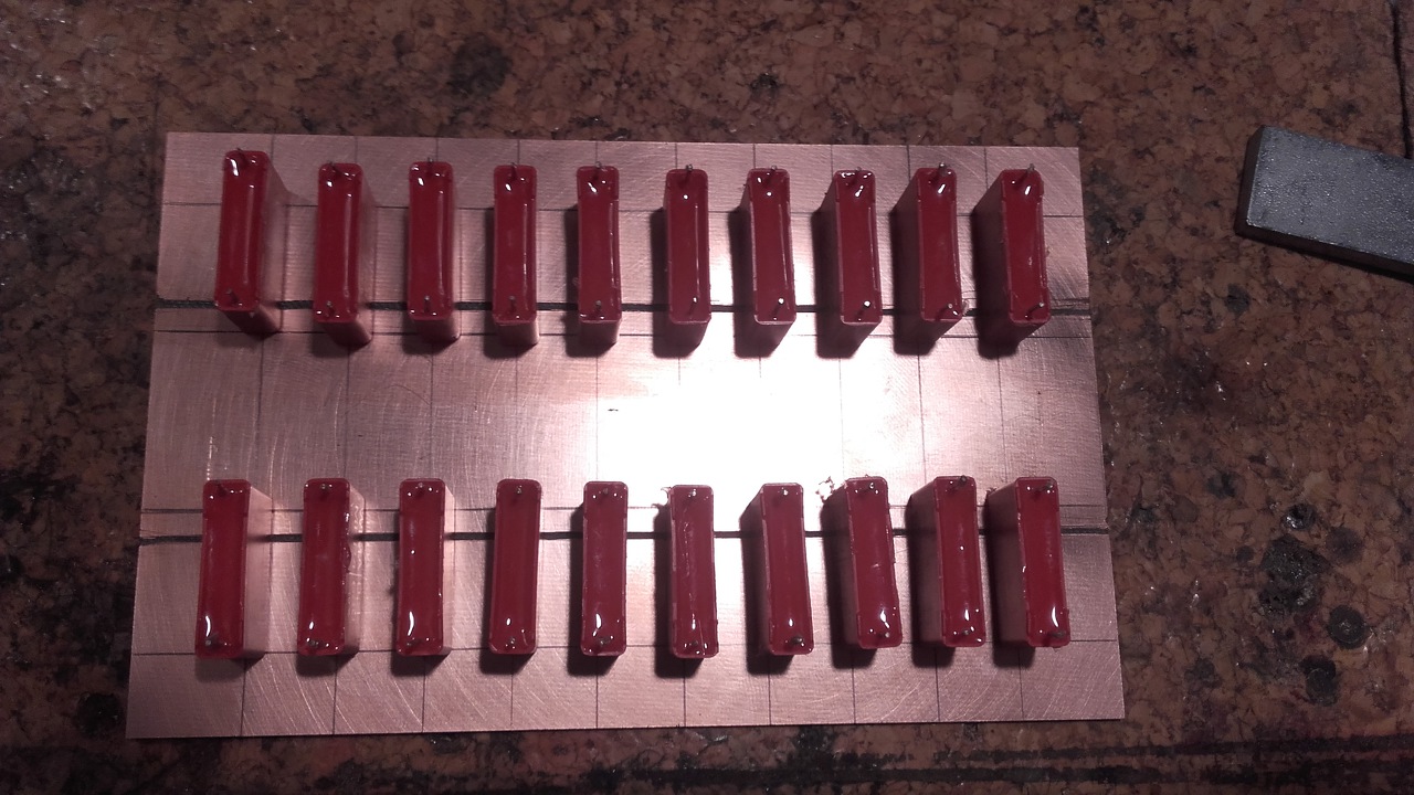A kondenzátorparknak a középső kivezetését nem használva, csak a két szélét bekötve 2.2 mikrofarad 1260volt az eredmény. Ha a két szélsőt összekötöm, és az eggyik pólusnak használom, a másikat pedig a középső vezetősávról veszem le, akkor 4.4mikrofarad 630volton az eredmény.