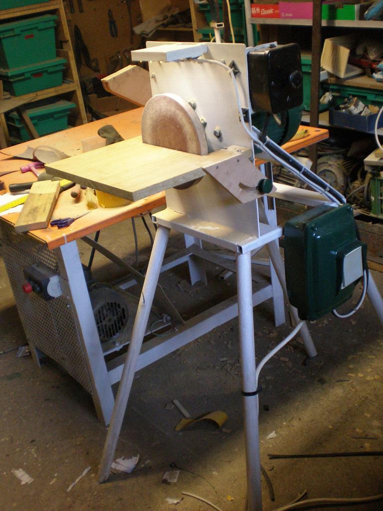 Elkészültem a tárcsacsiszolómmal. Abból készült, amit a ház körül (illetve nagyszüleimnél) találtam. 20cm átmérőjű tárcsa van benne. Beszerelésre került egy plusz axális csapágy, mivel a motor gyárilag nincs előkészítve tengelyirányú terhelésre. 60-as csiszolópapír van felragasztva a bútorlapból készült tárcsára, ez általános munkákra megfelelő.Az asztala szögbe dönthető. A motor egy gyárilag 750W-os háromfázisú szovjet villanymotor, de már egyszer régen áttekercselték, így a pontos adatait már nem tudom. Gyárilag a fordulatszáma 1450ford/perc volt, hogy most mennyi nem tudom, de pont jó csiszoláshoz. A zöld dobozban motorvédő van, illetve a LED-szalagból készült géplámpa tápegysége. Még valami porelszíváson gondolkodom, ötlet már van rá, de a kivitelezés még egy kicsit várat magára.