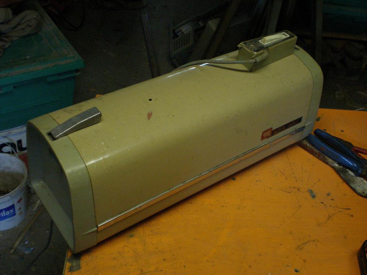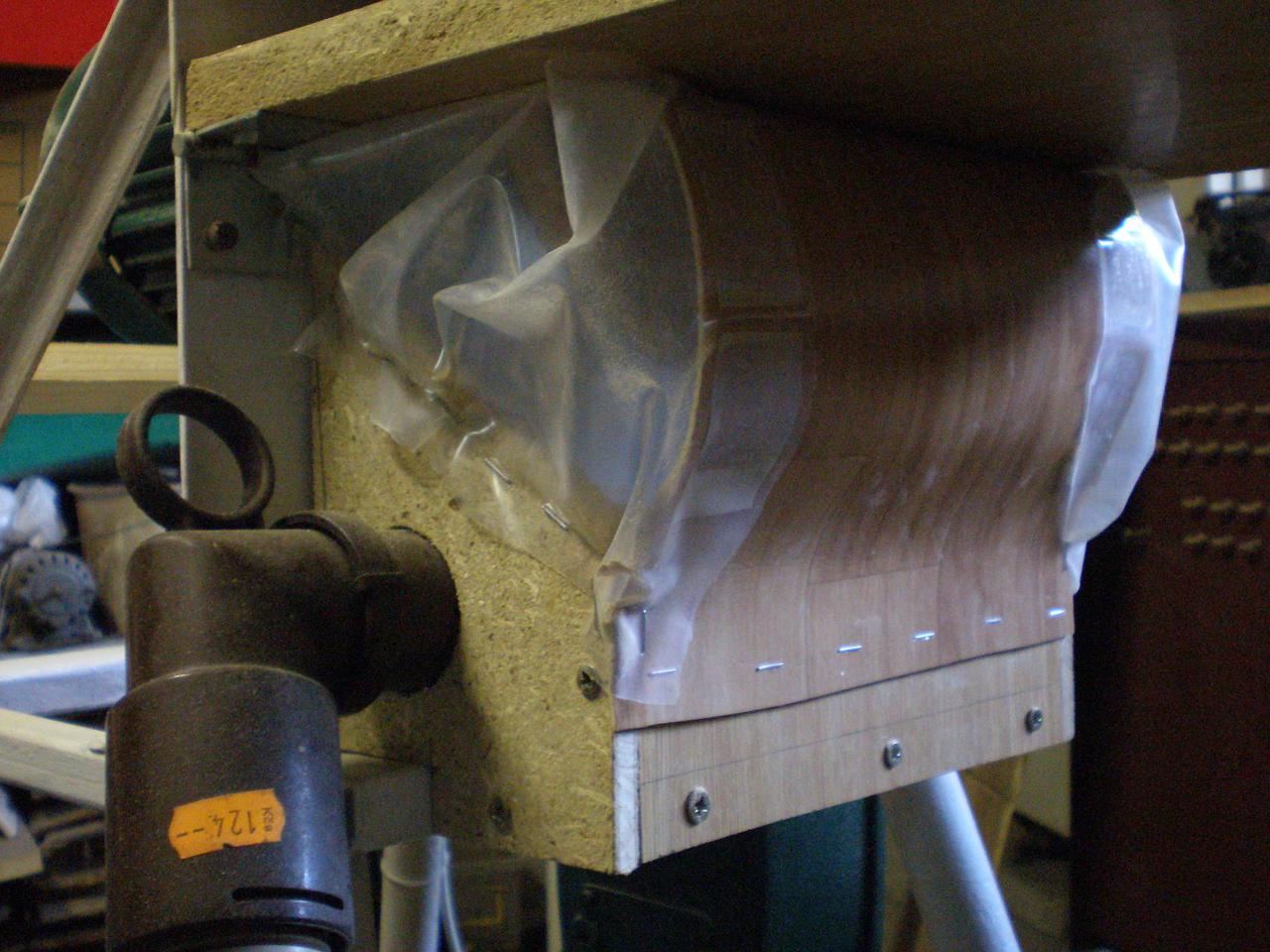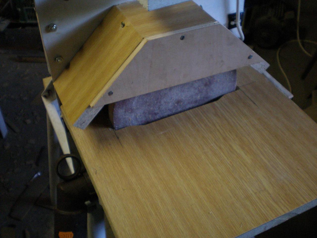 Befejeztem a porfogót. Ezt ötlöttem ki, fontos volt, hogy az asztal dönthetőségét ne zavarja. Az oldalán a fólia azért van meggyűrődve, mert csak így nem zavarja a döntést (ha szép spanosan teszem rá akkor döntés közben megfeszül és nem engedi 45°-ig lehajtani. Az elszívásról egy régi porszívó gondoskodik.