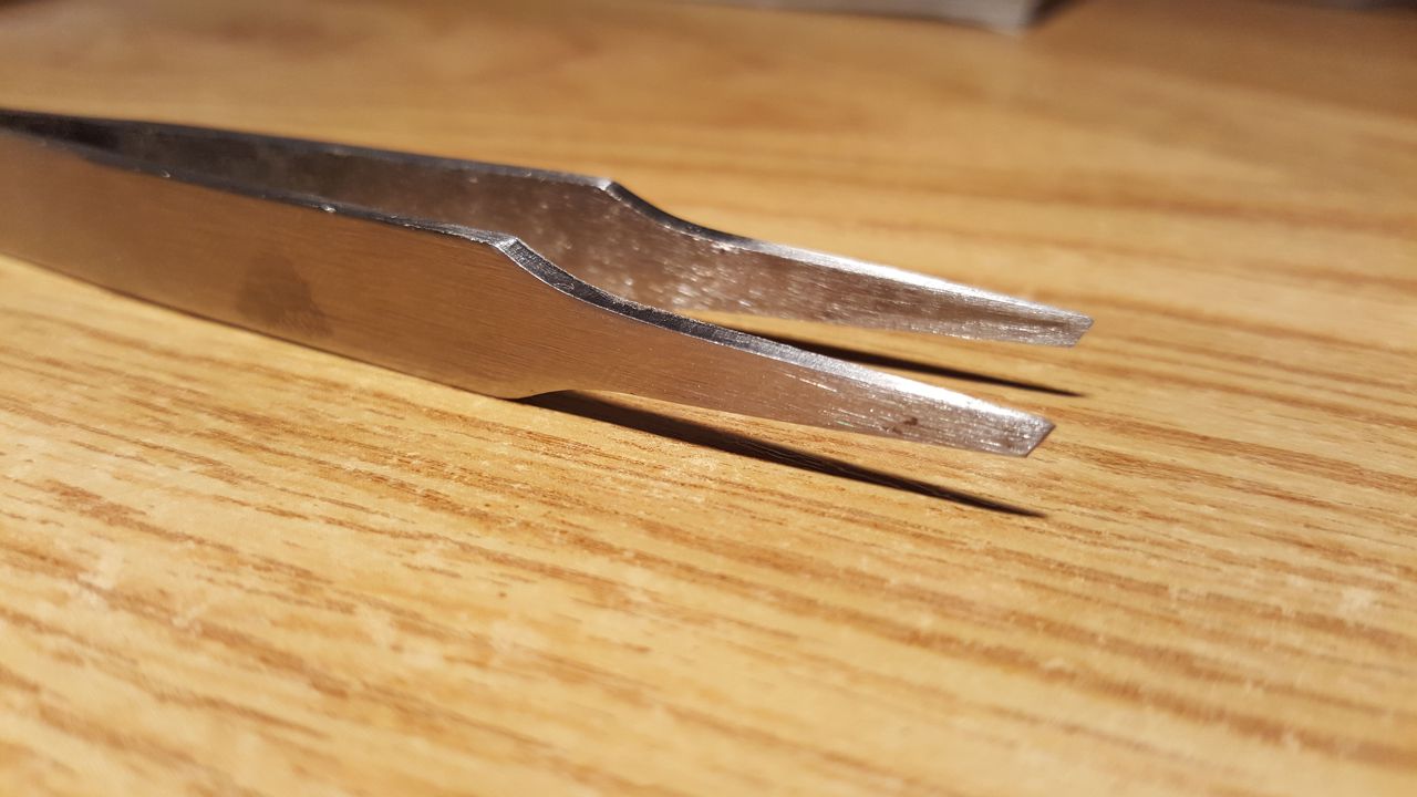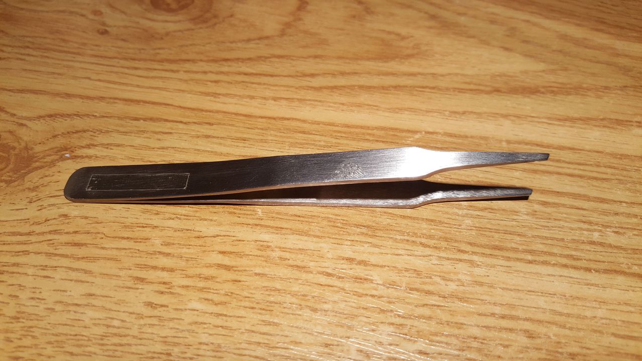 Remélem senki nem tekinti majd eretnekségnek, de én átalakítottam egy csipeszt. Eredetileg egy közel szabályos félkör volt a végén, és ezzel próbáltam az SMD alkatrészeket "idomítani" a panelon beforrasztáskor. Egy közepes minőségű szerszámról van szó, kb. 1000 Ft-ért vettem, de már rozsdamentes, nem fogja a mágnes, és az ón is lepattan róla ha ráfolyna. Már ez is a második a stáció volt, mert elsőre egy hasonló típusú, de tűhegyes csipeszt használtam, ami egyáltalán nem vált be, kényelmetlen volt pozícióba tartani vele az elemeket.
