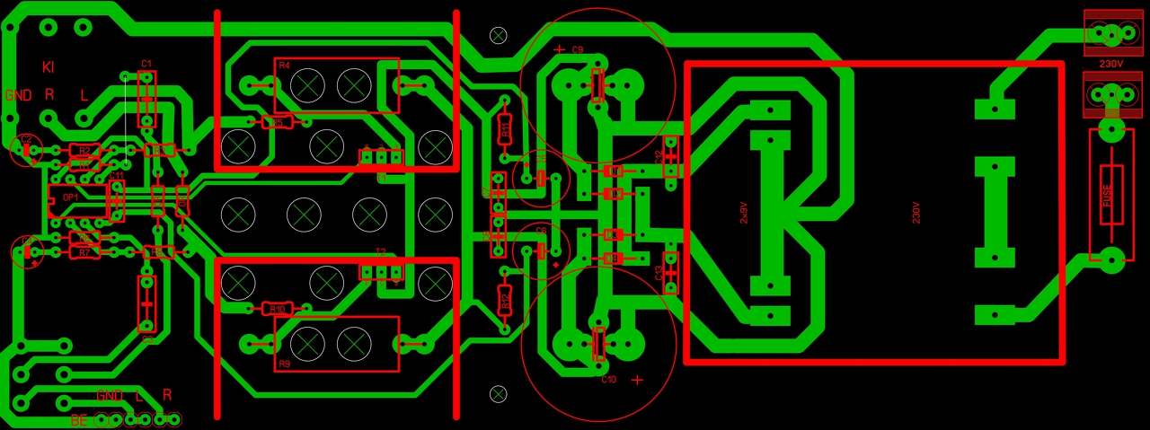Én egy gyári kapcsoláson nyugvó BUF634 + dual opamp-al megvalósított fejhallgató erősítőt szeretnék. Ennek terve látható a csatolt fájlban. A bemeneti kondiknál szándékosan hagytam nagyobb helyet (63/100/400V-os MKP-nak vagy egyébnek). Ja igen a feliratozás lemaradt, balra első 3-as csati a hang bemenet, utána a táp, majd jobb oldalt a két buf között a kimenet szintén egy 3-as tüskesorral (középen a föld mindenhol). Igazából a 6db tartó lyuk nem szükséges, csak nem vagyok biztos abban, hogy a középsők használhatók a csatlakozókhoz közel (csavarfej méret miatt). A 8 dil körül próbáltam több helyet hagyni ha netalán más opampot is kipróbálnék, könnyebb legyen szerelni. A két buffer egy hűtőbordára menne, illetve a lábait el fogom görbíteni, hogy ne soros TO220-5 legyen, hanem a könnyebben kezelhető sima. Illetve célom volt a minimális átkötés a panelon, egy lett összesen az alsó buffer + tápjához. A többi látszik a képen, kérdésem, hogy mire kell odafigyelnem, máshogy csinálnom, hogy ne legyen problémám a panel tervből adódóan? Ami felvetődött: 0.6-os vezetés a dil 8 / jumperek / tüskesorok lábai között, 1mm-es vezetés a tápnak, 1,5mm a földnek, túl közel levő vezetés. A válaszokat előre is köszönöm szépen!