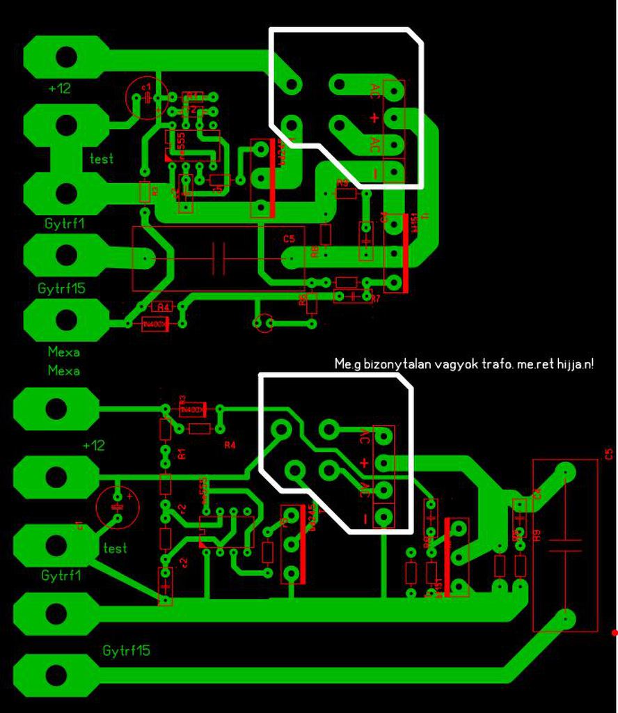 Valaki rátudna nézni hogy jól sikerült-e a nyáktervem? Ez alapján készül!. A trafó méretre igazítása majd akkor fog sikerülni ha a kezemben van az alkatrész, valamint a led is vezetékelve lesz egyenlőre csak az ellenállását tettem oda. Köszönöm előre is a segítséget!
