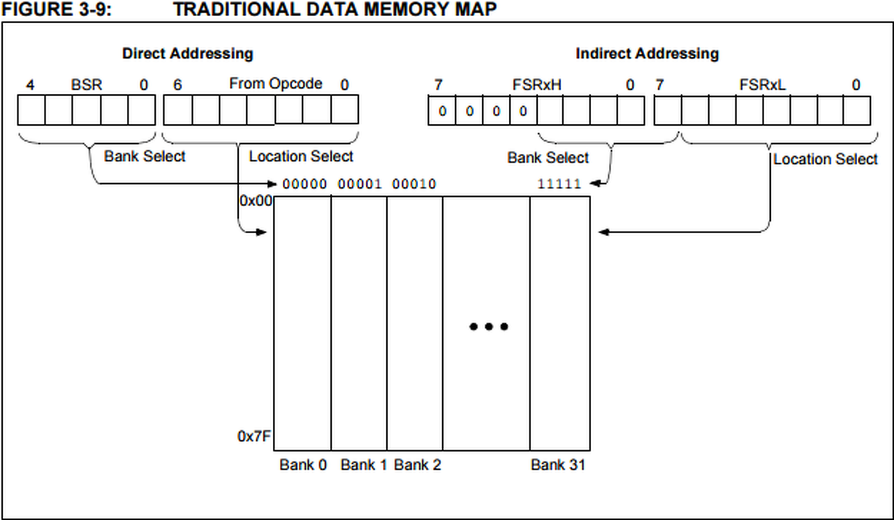 Már volt itt vagy a haladóban említve a PIC16F18857/77 4096 byte-os RAM-al, már nem emlékszem ki említette, de volt szó arról is, hogy a fordítót is át kell majd szervezni a 64 bank miatt. Na, most a doksiban 40-46 oldalon láthatjuk, hogy 64 bank van(0-63). Aztán ugrunk 88. oldalra az indircet addressing-hez és láss csodát a traditional addressing-be is csak 32 bank van és a linear addressing-ba is csak 32. Szóval van 4096 byte RAM-unk, de nem férünk hozzá? Vagy most megint "ügyes" volt a drága Microchip? Vagy én értem félre és a 32-63-ig csak direkt címzéssel érhető el? De nekem lehetetlenül van megoldva ez, 12 bites a RAM címzése és egy bank 128 byte-os akkor azzal csak 32 bankot tud címezni nem vagy ez meg csak az indirekt címzésre vonatkozik?