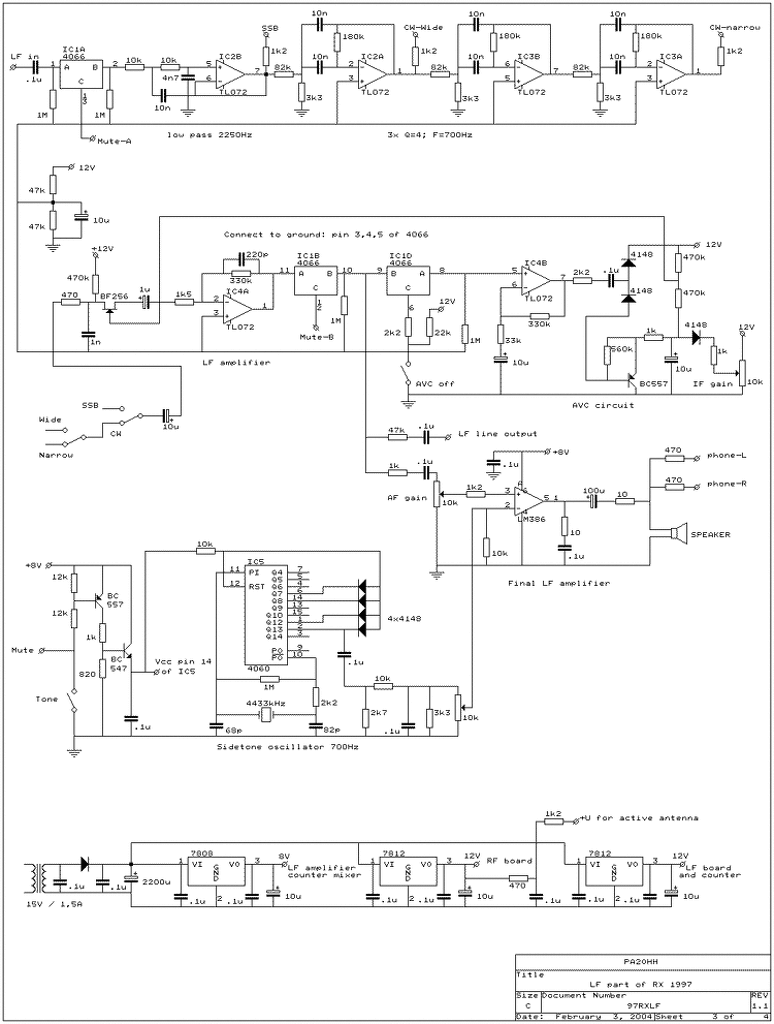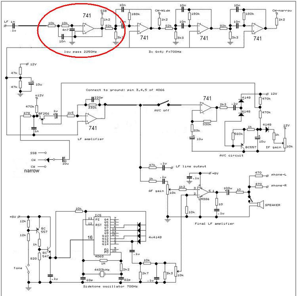 Nemrég találtam rá erre a rajzra, és úgy döntöttem, hogy megépítem, ez lesz a HF fokozat a következő rádiómban. Ma összeszereltem a rajz felső részén lévő szűrőrészt, viszont nem működik rendesen. Ha a bemenetre rákötöm a számítógép hangkimenetét és tápfeszültséget (+12V) is ráadom akkor egyik kimeneten sem jelenik meg a jel. Ha a tápfeszültséget kikapcsolom, akkor a kimeneteken van jel (a 10nF-os kondenzátorokon keresztül kerüli meg a műveleti erősítőket, de természetesen fokozatonként egyre halkabb). Viszont ha a bekarikázott rész műv. erősítőjét kiveszem, a tápfeszültséget pedig ráadom, akkor a bekarikázott részben lévő 10nF-os kondin átjut a jel a következő fokozatba, aminek a kimenetén megjelenik a vágott jel, a CW narrow kimeneten szintén megjelenik a még jobban vagott hang. Vagyis a bekarikázott rész nem működik jól. A paneltervet átnéztem, az jó, és az IC a tápfeszültséget is megkapja. Lehet, hogy rossz a rajz, más részen is találtam elírást. Viszont én kevés vagyok ahhoz, hogy ezt megmondjam.