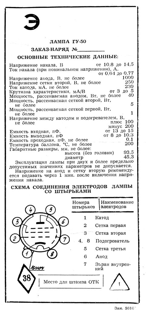 Fűtőfeszültség 10,8-tól 14,5-ig. Fűtőáram 0,64 A-tól 0,77-ig. Anódfeszültség max. 1000 V. Katódáram 230 mA. Meredekség 3-5 mA/V Ház külső hőmérséklete max. 200 C_fok. Rácskapacitások... Magasság, átmérő, de ez a legkevésbbé fontos. Teljesítmény 40 W Katód feszültsége a fűtéshez képest: +100, -200 V. Segédrácsteljesítmények 5 és 1 W. Nem volt kedvem megkeresgélni, pontosan melyik segédrács.