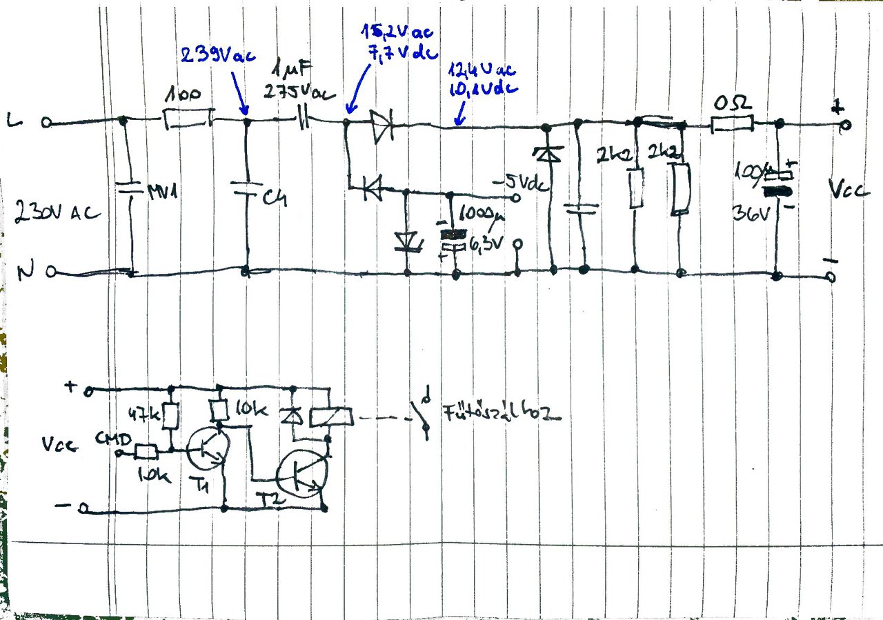 Szeretném a segítségetetek kérni egy relé tápfesz problémával kapcsolatban. Konkrétabban egy Candy mosogatógép fűtéskapcsoló reléjével küszködök, de a kérdésem teljesen elektronikai alapszintre vonatkozik, nem mosogatógép specifikus, ezért ebbbe a topikba írok. A masina tökéletesen működik, csak a víz fűtése nem kapcsol be amikor be kellene. Addig eljutottam, hogy az SMD szerelt vezérlőpanelen van egy relé, ami a fűtőszálat kapcsolgatja, ez a relé nem húz be. Egy OMRON G5LE-1-VD 24Vdc reléről van szó, ami adatlap szerint 24V * 75% = 18V-tól húz be. A kontroller IC egyik DO lábáról megkapja a kapcsolójelet, viszont amikor a kapcsolójel aktív, akkor a relé lábain csak 9V DC-t mérek 24 V helyett. Feltérképeztem a vezérlő tápáramkörét. A 230V AC-ből közvetlenül egyutas egyenirányítással és zener diódákkal két tápot állít elő. Az egyik az -5 V DC a kontroller IC számára, ez rendben van. A másik DC feszültséget csak a relé használja, ez gondolom 24V DC kellene hogy legyen, ezt Vcc-vel jelöltem a rajzon. Elnézést a Móricka rajzért, remélem áttekinthető. A kékkel jelzett feszültségeket úgy mértem, hogy a 0 ohmos átkötést megszakítottam kísérletezésként. Így igaz puffer kondi nélkül, de csak 10,1 V DC (illetve 12,4 V AC) a feszültség, ez már itt nagyon nem jó szerintem. Tudnátok tippet adni, hogy melyik alkatrész lehet a lúdas? Az 1 µF-os soros kondi gondolom még rendben van, mert különben a -5V DC kontroller táp se lenne jó és nem menne a vezérlés. Lehet, hogy a Vcc tápkör zenerje lesz a bűnös?