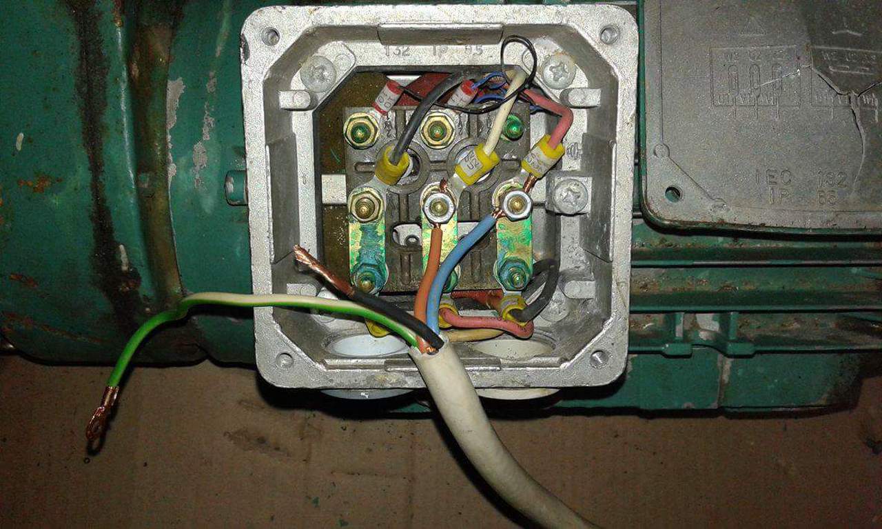 Az adatlap.jpg szerint ez egy 380V-ra készített háromfázisú motor, delta bekötéssel. Négyeres kábel szükséges hozzá. Ebből három a fázisoké, egy pedig a földelés, azaz a készülék fém burkolata.