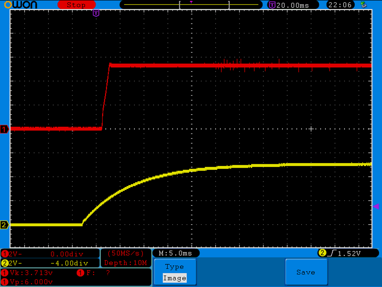 A piros a kimeneti feszültség, a sárga pedig az EN láb. Külső labortápról kapcsoltam oda az 5V-ot.