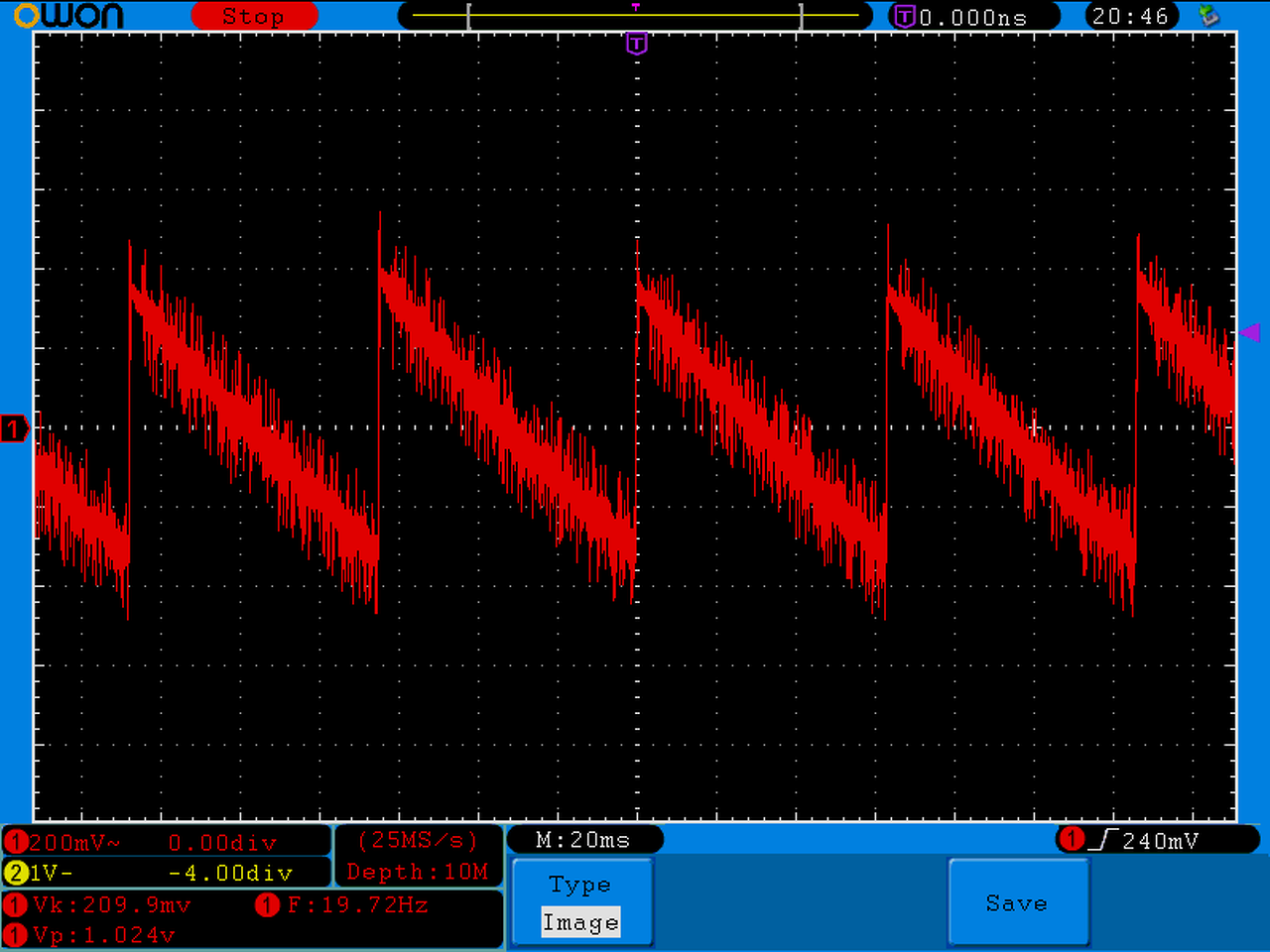 Kicsit zavarban vagyok, mert ez nem az a fűrész amit eddig Skorival láttunk az ő szkópján. Nem nagyon tudom hova tenni a dolgot... Próbáltam előállítani az akkori állapotot de nem sikerült sehogy előcsalogatni azokat a több száz mV amplitúdójú fűrészjeleket. Mondjuk igazából ez jó.