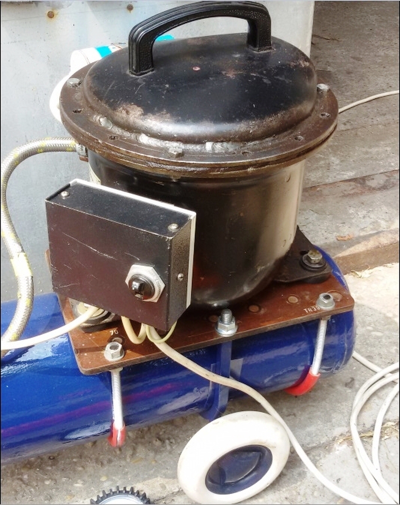 Sziasztok! Hát nagy sokára összedobtam én is egy tartályos megoldást a kimustrált hűtőgép kompresszorból. Eddig csak kézi indítású volt de most relés lett az indítása és nyomáskapcsoló végzi az automatikus végnyomáson való kikapcsolást és visszakapcsol a diferencia alsó értékénél. Most 4.5bárra állítottam, mert az óra az 5báros és nem szeretném ha az tönkre menne. Így most már lehet vele nagyobb nyomással is tisztogatni esetleg fúvókákat és üregeket no és persze az autó kereket is fel tudja nyomni. A tartály az egy poroltóból van a csatlakozások pedig 3/4"-os vizes idomokból. A nyomáskapcsoló ismeretlen, mert a fedelet nekem kellett rá kiötlenem de egy szivattyúról buheráltam és gondoltam, hogy ide erre a feladatra tökéletes lesz.