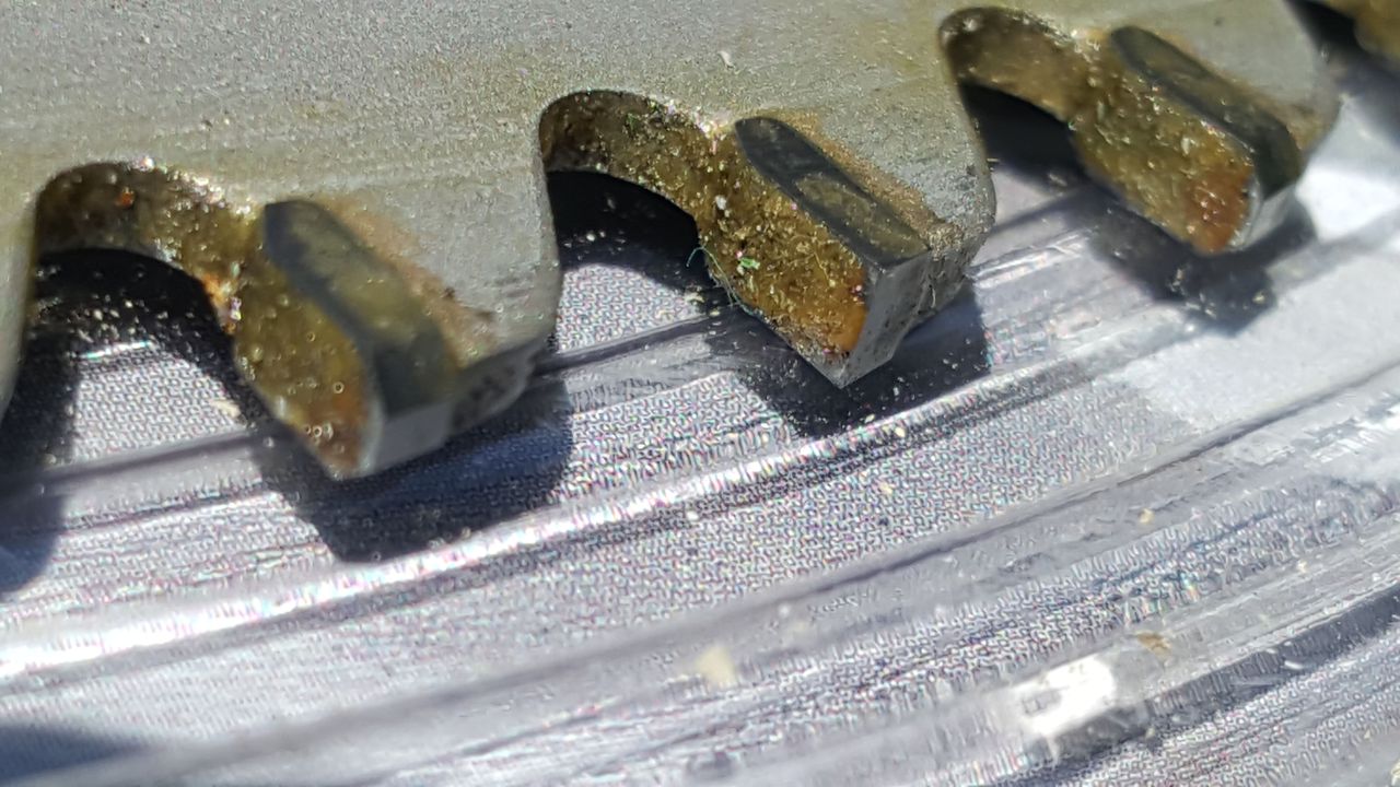 A saját készítésű, "gyorsdarabolónak" tervezett gépemet használtam. Ennek több sajátossága mellett, egyik fontos erénye a stabilitás, és a billenő tengely széles csapágyazása, mert így egyáltalán nem billeg oldalirányba a mozgó rész. Felraktam egy sok fogú (nem számoltam meg, a felirat meg már nem látszik rajta), és egyértelműen negatív vágószögű korongot. Ennek se tudom az értékét, de szemre kb. -3° körül lehet. A tárcsa nem volt élezve, régóta használam fa darabolására, legutóbb rétegelt lemezt szeleteltem vele, mert nagyon kicsi sorjával tud darabolni. Az eredmény minden várakozásomat messze felülmúlta. A vágás gyorsan megy, pedig igyekeztem finoman adagolni a kézi előtolást. Két borda mindkét végét megvágtam kb. 3 perc alatt, és ebben még ütközőállítás is volt. A hűtőborda egészen vékony bordái egyáltalán nem hajoltak el a vágás irányába. A vágott felület szinte nem is igényel utómunkát olyan egyenletes. A borda vágott felületén szinte egyáltalán nincs sorja. Külön kipróbáltam, hogy nem teljes fogszélességben vágtam, hanem csak egy kb. 0,5 mm-es fogással. Az eredmény itt is tökéletes, nyoma sincs oldalirányú kinyomásnak, a felület minden pontján éppen 0,5 mm-t vitt a szerszám. Sokkal előbb ki kellett volna ezt próbálnom, mert sok verejtéket, időd, és fáradságot spórolhattam volna. A vágott felület, a rendelkezésemre álló mérési módszerek alapján tökéletesen sík, és minkét irányba merőleges. Néhány fotóval is próbálom szemléltetni az eredményt. A műhely világítása nem kifogástalan, ami részben látszik is.