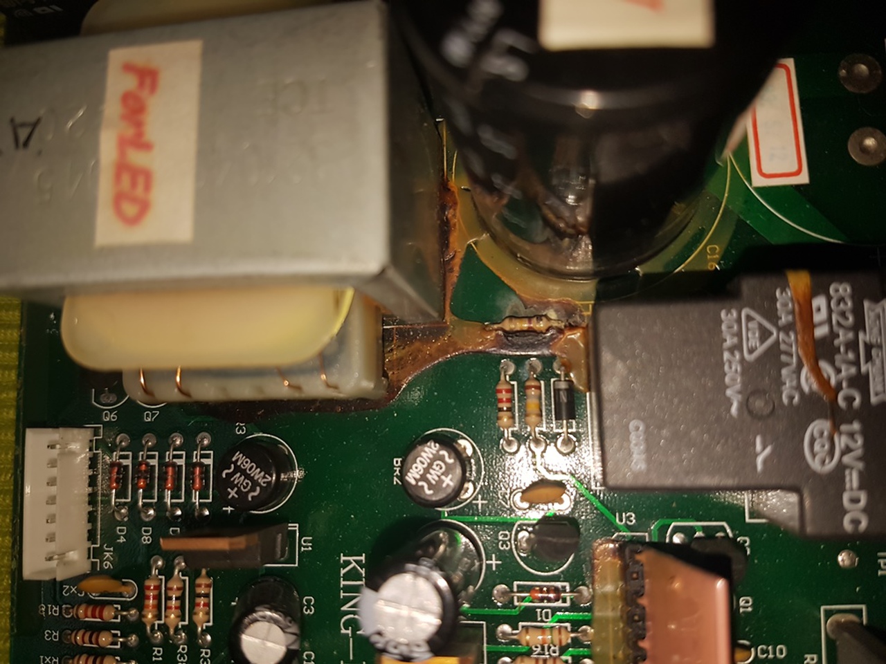 Sziasztok, újra itt vagyok. A következő történt a vezérléssel. Bekapcsoltam a futógépet, hogy a kijelző panelen mérjek. A lenti panel a parkettán volt. Nem ért semmi fémhez, nem látszott víz sem. Áram alá helyezéskor már szikrázott egyszer, majd a következő áram alá helyezéskor csattant is ugyanott egy nagy villanás kíséretében. A képen látszik, hogy ragasztó, vagy gyanta fogta a nagyobb alkatrészeket. Ez a ragasztó gondolom idővel a melegtől elkezdett szenesedi. Valószínűleg ezen lecsapódott a pára, és ott zárt rövidre. Nem látok rajta sérülést ott, ahol szikrázott. És máshol sem. Viszont kivettem a trafót, relét, nagy kondit, hogy levakarjam az égett ragasztót. A nagy kondi 470 mikrós gyárilag, viszont mérve csak 430, és ESR mérővel sem mutat jó értéket. Szóval cserés, plusz van ott egy ellenállás, lehet, hogy mégis az kapott egyet a szikrázáskor. Talán sárga-lila-sárga-arany van rajta, az első szín alig látszik. De anélkül is, hogy ezt tudnánk, ez nx100K-s tartomány, nekem pedig megás tartományban ugrált a műszer. Szóval ez is cserés, de az első színt passzolom. Egy hét múlva megyek haza, akkor megveszem hozzá a kondit, meg egy 470K-s ellenállást. Az ellenállás párhuzamos a 470 mikrós kondival. Ezen kívűl a nyomógombok sem reagáltak túl jól a zárlatkeresővel mérésre. Bár a gépet bekapcsolva a kijelzőn reagáltak. Az optót nem tudtam még megmérni, mert ugye kondi, ellenállás nincs a helyén. A Q27 bázisa ellenállások hadán át megy szerteszét, de majd átrajzolom egy lapra, és felteszem ide. Ugyanígy a start gombbal is. Még annyi, hogy mivel UK-ben élek, lehetséges a páralecsapódás a panelen, főleg mostanában végig esett is. üdv, hegusp