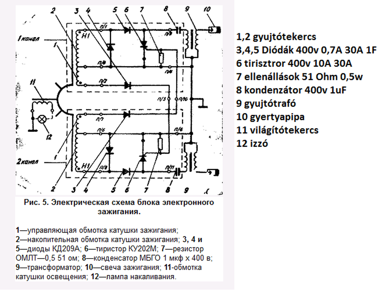 A dióda volt a rossz. Kivettem egy diódát egy kb 40 éves NDK mosógép programkapcsoló szinkronmotor táptekercséről, beraktam a rossz helyére,és hála istennek működött, azaz van szikra mindkét hengernél.. addig kellet ,hogy kipróbáljam amíg nem szerzek egy 400 voltosat de holnap indítópróba lehet hogy jó lesz bele az is mert régen inkább túlméretezték a dolgokat. Majd kiderül. Azért vicces hogy egy kb 40 éves Keletnémet alkatrészt sikerült raknom egy 1984 gyártású CCCP-s gépbe. További szép hétvégét és jó nyaralást( helyettem is )mindenkinek!