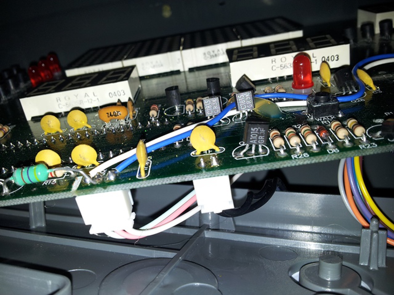 Sziasztok, újra itt vagyok. A következő történt a vezérléssel. Bekapcsoltam a futógépet, hogy a kijelző panelen mérjek. A lenti panel a parkettán volt. Nem ért semmi fémhez, nem látszott víz sem. Áram alá helyezéskor már szikrázott egyszer, majd a következő áram alá helyezéskor csattant is ugyanott egy nagy villanás kíséretében. A képen látszik, hogy ragasztó, vagy gyanta fogta a nagyobb alkatrészeket. Ez a ragasztó gondolom idővel a melegtől elkezdett szenesedi. Valószínűleg ezen lecsapódott a pára, és ott zárt rövidre. Nem látok rajta sérülést ott, ahol szikrázott. És máshol sem. Viszont kivettem a trafót, relét, nagy kondit, hogy levakarjam az égett ragasztót. A nagy kondi 470 mikrós gyárilag, viszont mérve csak 430, és ESR mérővel sem mutat jó értéket. Szóval cserés, plusz van ott egy ellenállás, lehet, hogy mégis az kapott egyet a szikrázáskor. Talán sárga-lila-sárga-arany van rajta, az első szín alig látszik. De anélkül is, hogy ezt tudnánk, ez nx100K-s tartomány, nekem pedig megás tartományban ugrált a műszer. Szóval ez is cserés, de az első színt passzolom. Egy hét múlva megyek haza, akkor megveszem hozzá a kondit, meg egy 470K-s ellenállást. Az ellenállás párhuzamos a 470 mikrós kondival. Ezen kívűl a nyomógombok sem reagáltak túl jól a zárlatkeresővel mérésre. Bár a gépet bekapcsolva a kijelzőn reagáltak. Az optót nem tudtam még megmérni, mert ugye kondi, ellenállás nincs a helyén. A Q27 bázisa ellenállások hadán át megy szerteszét, de majd átrajzolom egy lapra, és felteszem ide. Ugyanígy a start gombbal is. Még annyi, hogy mivel UK-ben élek, lehetséges a páralecsapódás a panelen, főleg mostanában végig esett is. üdv, hegusp