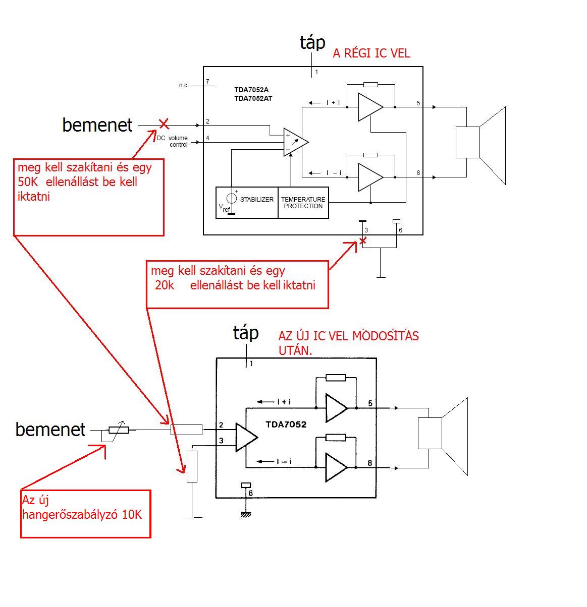 Itt van kapcsolási rajz. Csak ezzel fog elindulni a 7052A IC!(Tényleg bocs azt hitem hogy az A-s IC halt meg, és egy másik nem A-sal akarod müködtetni.)