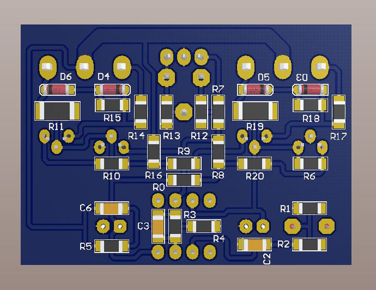 Készítettem egy még nem végleges, jelenleg 49x36mm méretű nyáktervet (az alkatrészeket még némileg mozgatni kell, mert egyelőre nincsenek rajta a nyákon a ki- és bemenetek, valamint a tápcsatlakozások), és szeretném kikérni a hozzáértők véleményét, hogy jó irányba megyek-e, esetleg min kellene mindenképpen változtatnom, vagy felejtsem el az áttervezést. Az alsó réteg mindenképpen telifóliás lenne, de ha szükséges, akkor a felső is az lehet. A terv az Alkotó-féle rajzolat pozíciószámainak megfelelően készült. Az R0 jelű "ellenállás" az egyetlen átkötés a panelon.