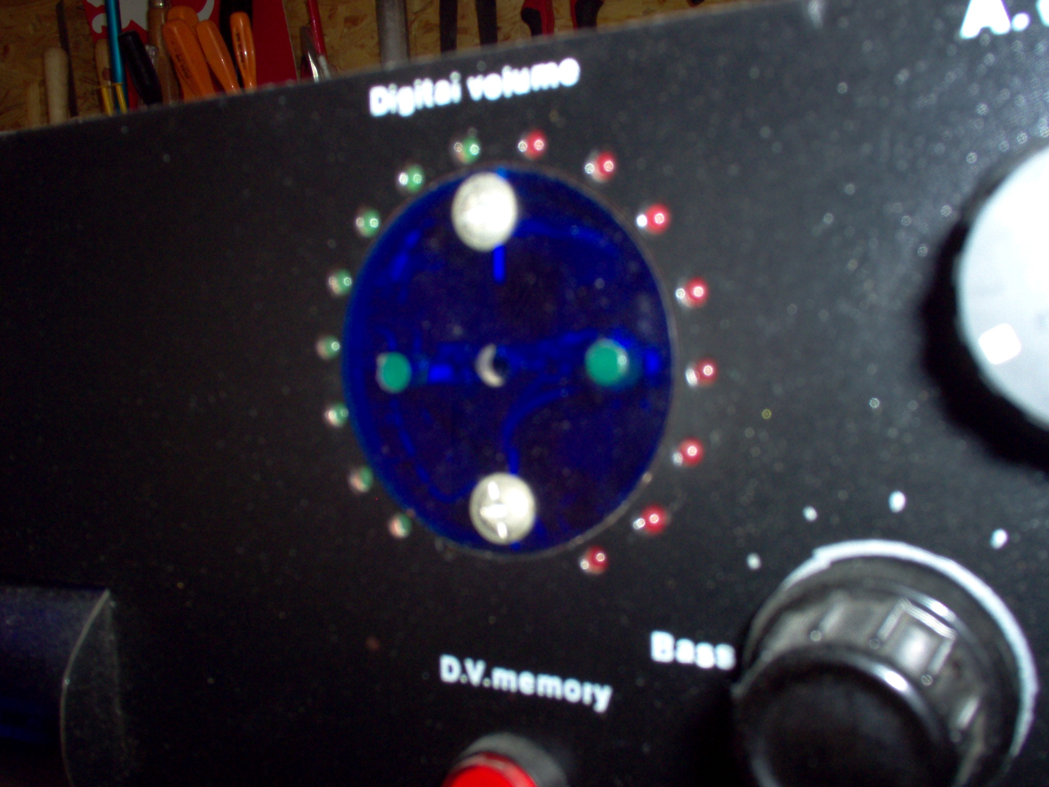 Lenne középen egy hangerő szabályzó gomb, körülöte zöld vagy kék ledekkel. Ezt v.hogy úgy képzeltem, hogy egy kivezérlésjelzőt átalakítani úgy, hogy fix tápfeszt kapna, mondjuk stabil 5V-ot és a hangerő poti tengelyére rákötni a kivezérlésjelző trimmer potiját (ezzel állítható a bemenő jel nagysága, ebben az esetben a bemenő jel ugye 5V.) A hangerő poti körül elhelyezett ledek pont addig világítanának, ahol a poti áll. Sz.tem jópofa lenne.