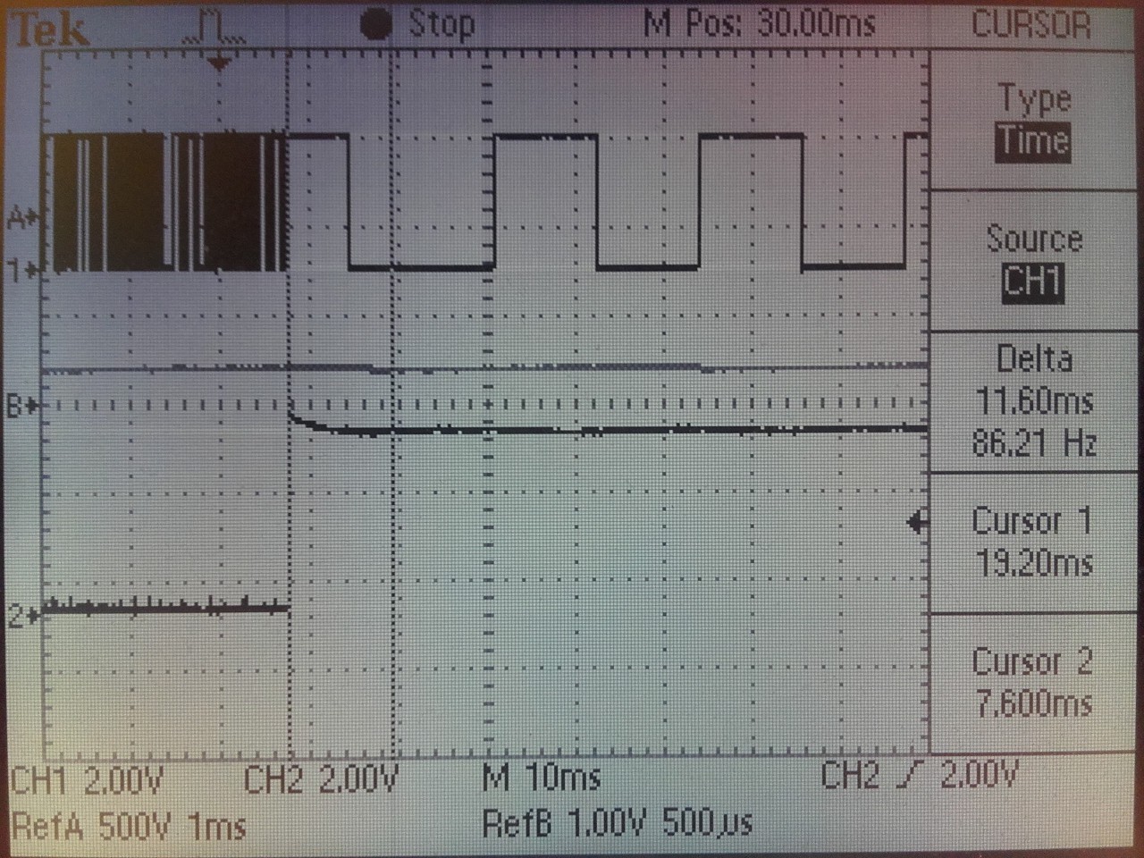 De megpróbáltam igazolni/megcáfolni a kikapcsolós állításomat, és azt hiszem előbbi sikerült. Úgy állítottam be a konstrukciót, hogy gombnyomásra küldjön 100 bitnyi négyszögjelet. (itt kb 11.6ms egy bit) Mint látni, az első magas bit vége "le van csípve" és alacsony, de az utána jövők rendben vannak teljesen. A képen a CH2 emelkedése egy gombnyomás az adón, arra triggerelek, hogy könnyebben megtaláljam a jel elejét. A fönt lévő CH1 jel a vevő kimenete. A cursor úgy van beállítva, hogy a kettő között van az első bit, köztük végig magasnak kéne lennie a jelnek. (két szaggatott függőleges vonal) Neked nem csinálnak ilyet? A hozzászólás módosítva: Aug 12, 2016
