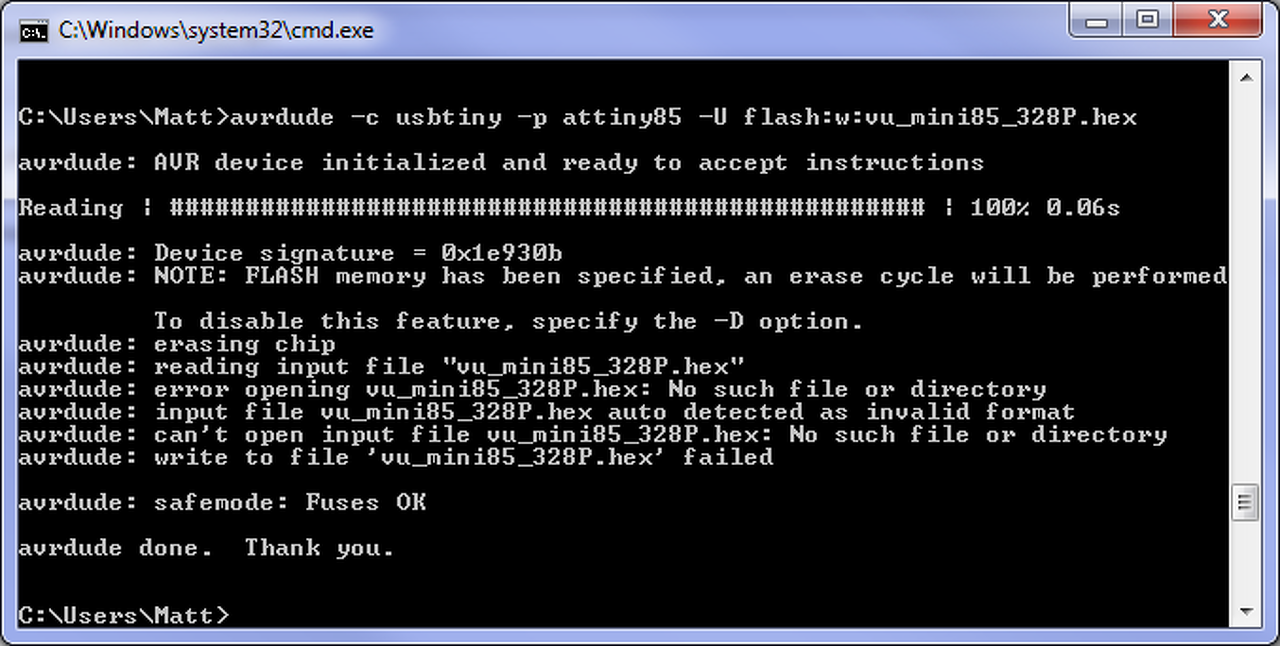 A vu_mini85_328p.hex file valószinüleg nincs a C:/Users/Matt mappában.