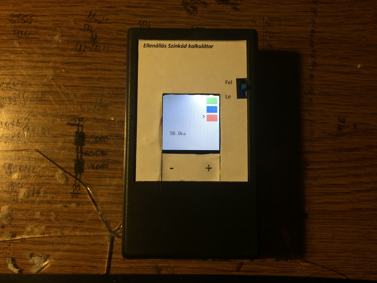 Egy jó ideje gondolkoztam már egy olyan eszközön, amivel bárhol, egyszerűen ellenállás értéket tudok számolni színkódból. Tudom, hogy nem bonyolult táblázat, de szeretek biztosra menni. Ezért is építettem egy kis eszközt aminek, ha megadom az ellenállás színkódját, az megmondja nekem az értéket. Netről vadásztam össze a Nokia 6100 kijelzőhöz tartozó parancsokat, hogy hogyan is kell kezelni, majd saját magamnak megírtam egy programot ami a karakterek és a szövegek kezelésére alkalmas. Ez teljes magyar karaktertáblát és néhány extra karaktert támogat. ![]() Az első képen látható érték, a színek hibás beállítása miatt még nem pontos