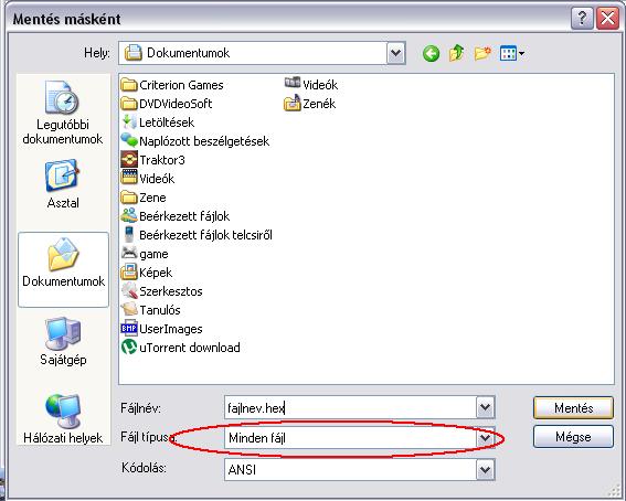 Hogy ne nyissa meg a böngésző a hex-et, kattints a linkre jobbklikkel, majd "Mentés másként" (vagy "Cél mentése másként")-ra. Ha így se megy, akkor nyitsd meg jegyzettömben, és mentsd hex fájlba, úgy ahogy a képen látható. A lényeg, hogy a típusnál "minden fájl" legyen, és a fájlnév vége .hex legyen. Vagy végső esetben bemásolod a linket és gyors megcsinálom neked.