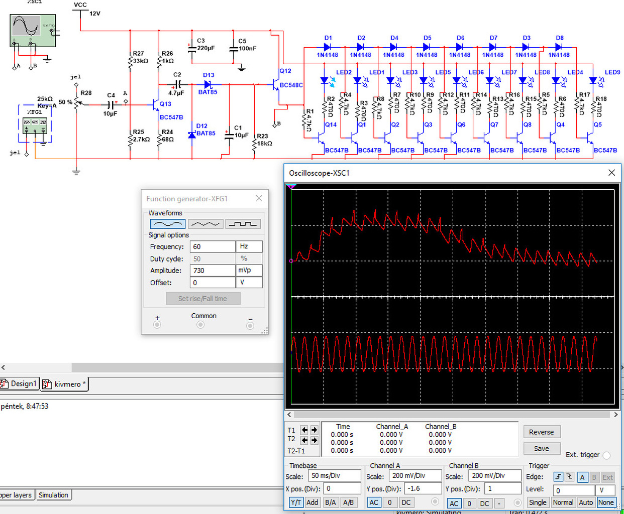 Gondolkodtam hova tegyem be ezt a kérdést, de miután a kivezérlésmérővel kapcsolatos inkább ezért ide kerül. Ismerkedem a Multisim-el, megpróbáltam benne összerakni a kapcsolási rajzot, de valahogy nem igazán stimmel. Esetleg rá tudna nézni egy hozzáértő hogy miért nem úgy néz ki a bemenő jel erősítése ahogy talán kellene? Én nem értem egészen ezt most. Köszönöm!
