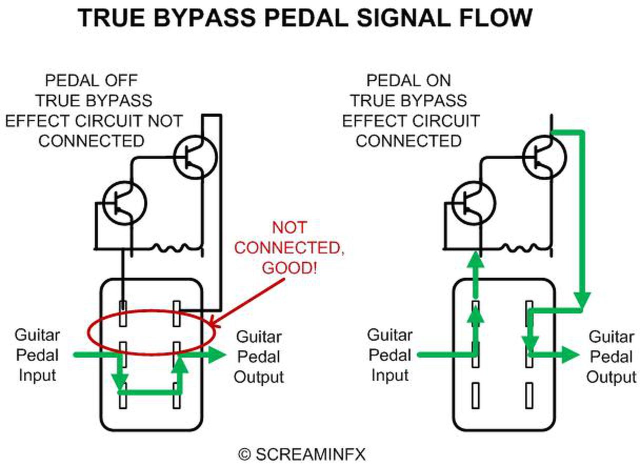 Így tudod bypassolni(mellékelt kép), de elég a sima kapcsoló helyett taposhatót rakni. Az eredeti kapcsolásban a kapcsoló zárásával némítod a zengetőt. A jel tisztán megy tovább.