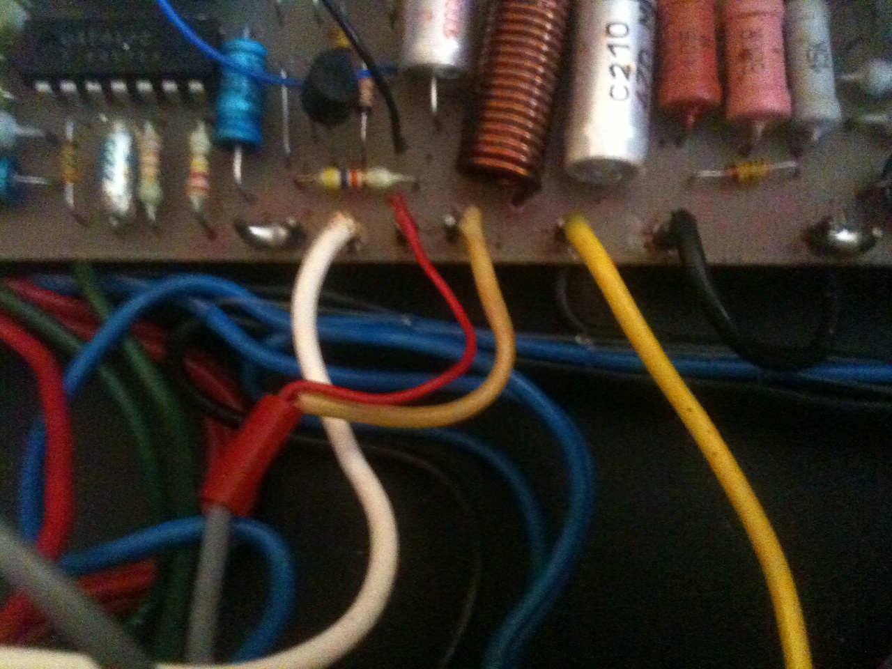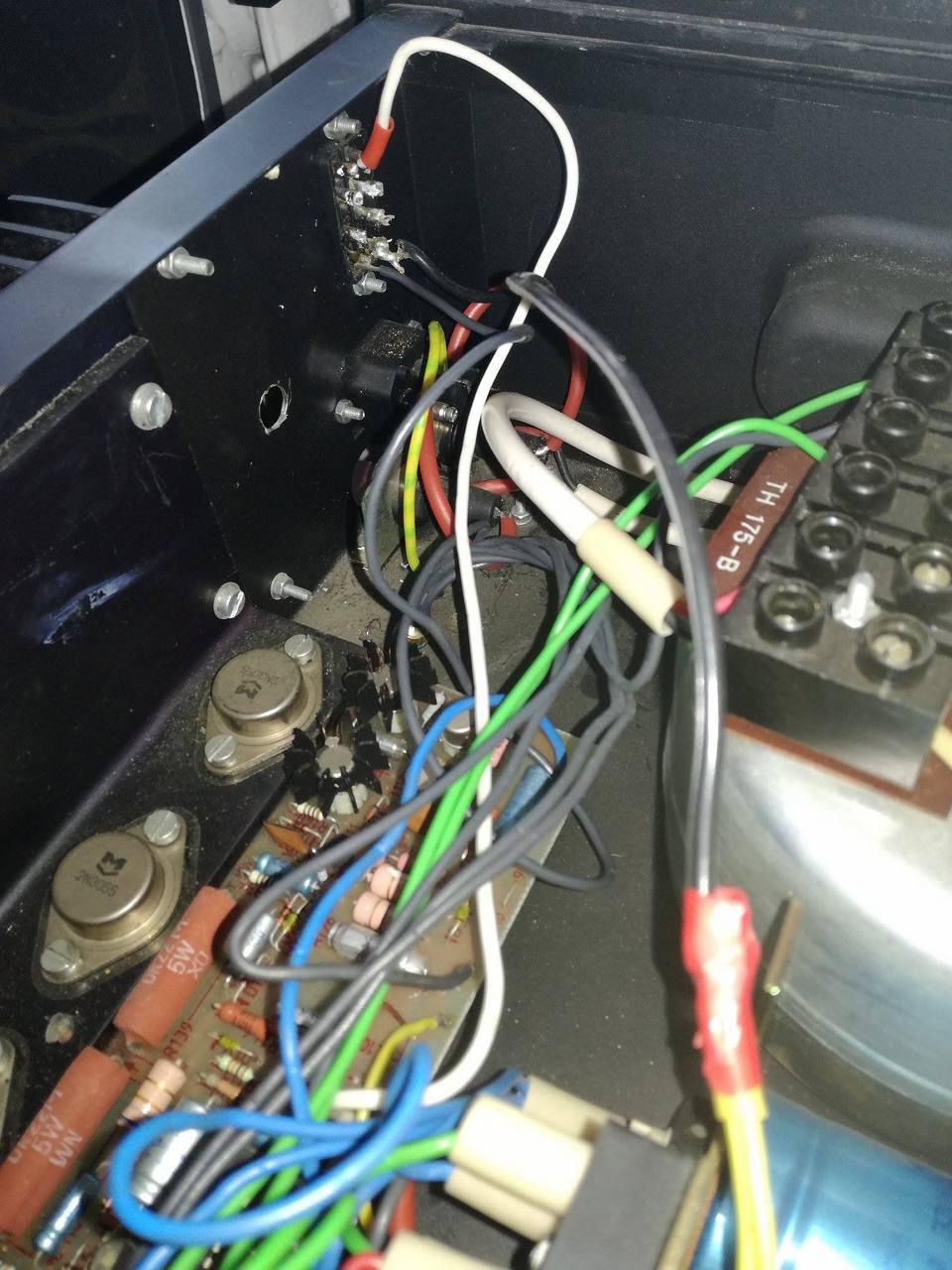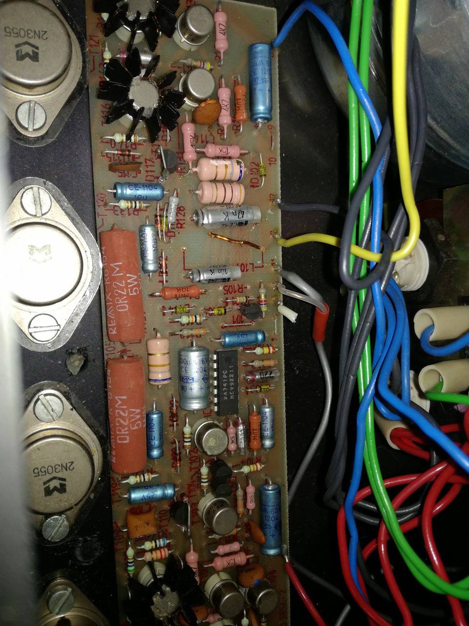 Kép a végfokról. Itt ugye a piros és a mellette lévő vékony sárga a jel,a nagyobb sárga a kimenet,a mellőle lejövő fekete megy a központi gnd-re. A fehér viszont nem tudom hova ment.