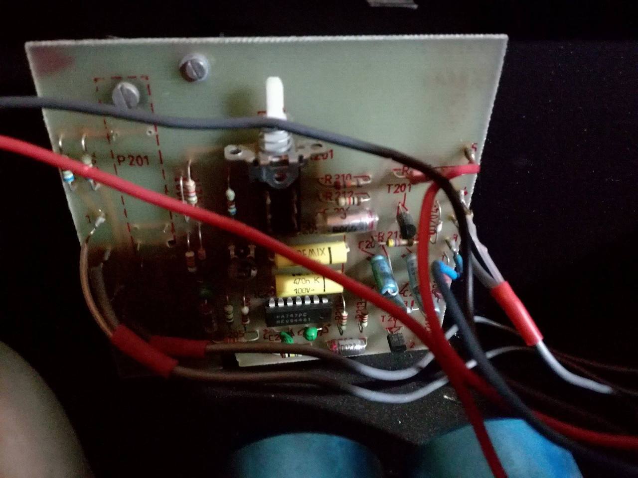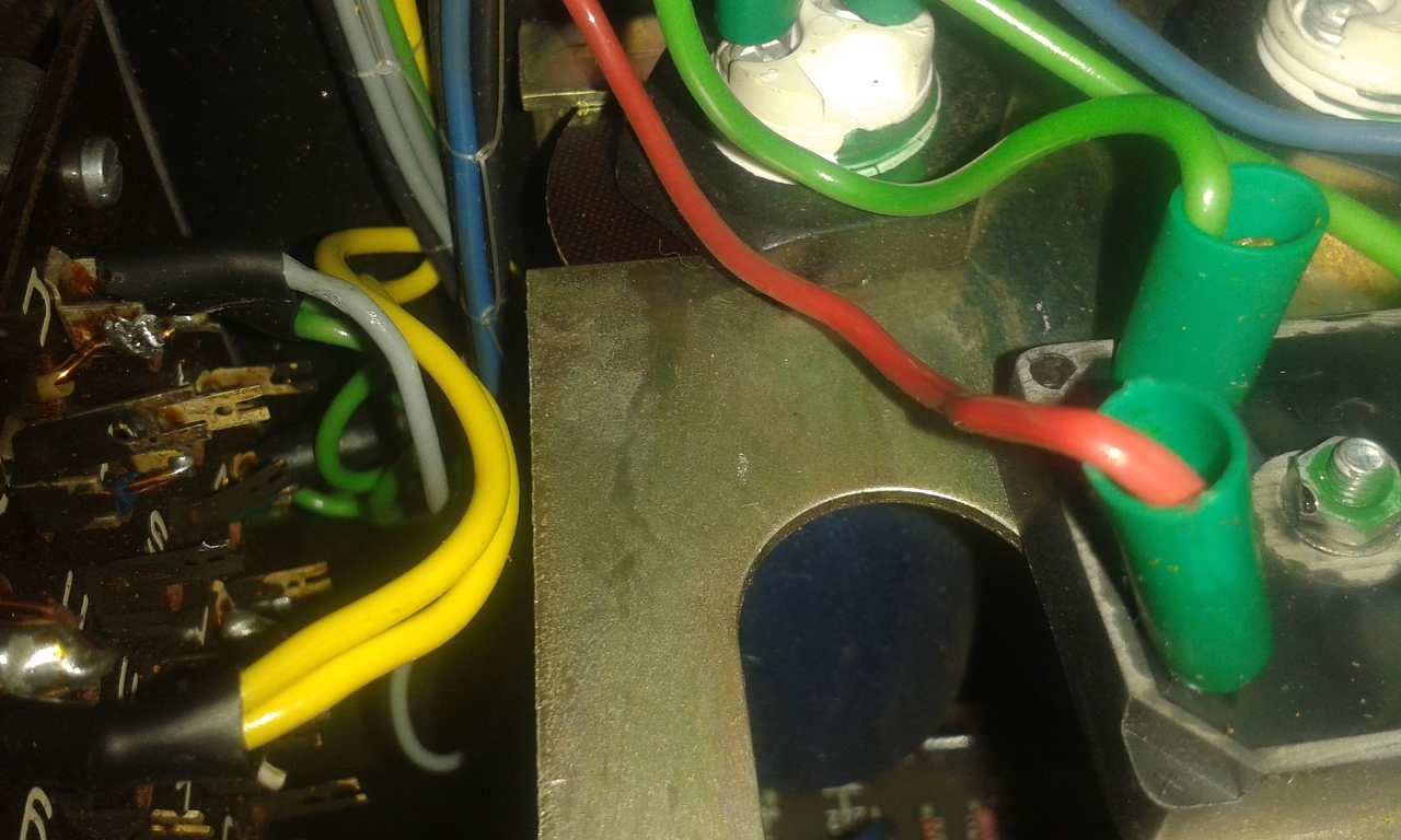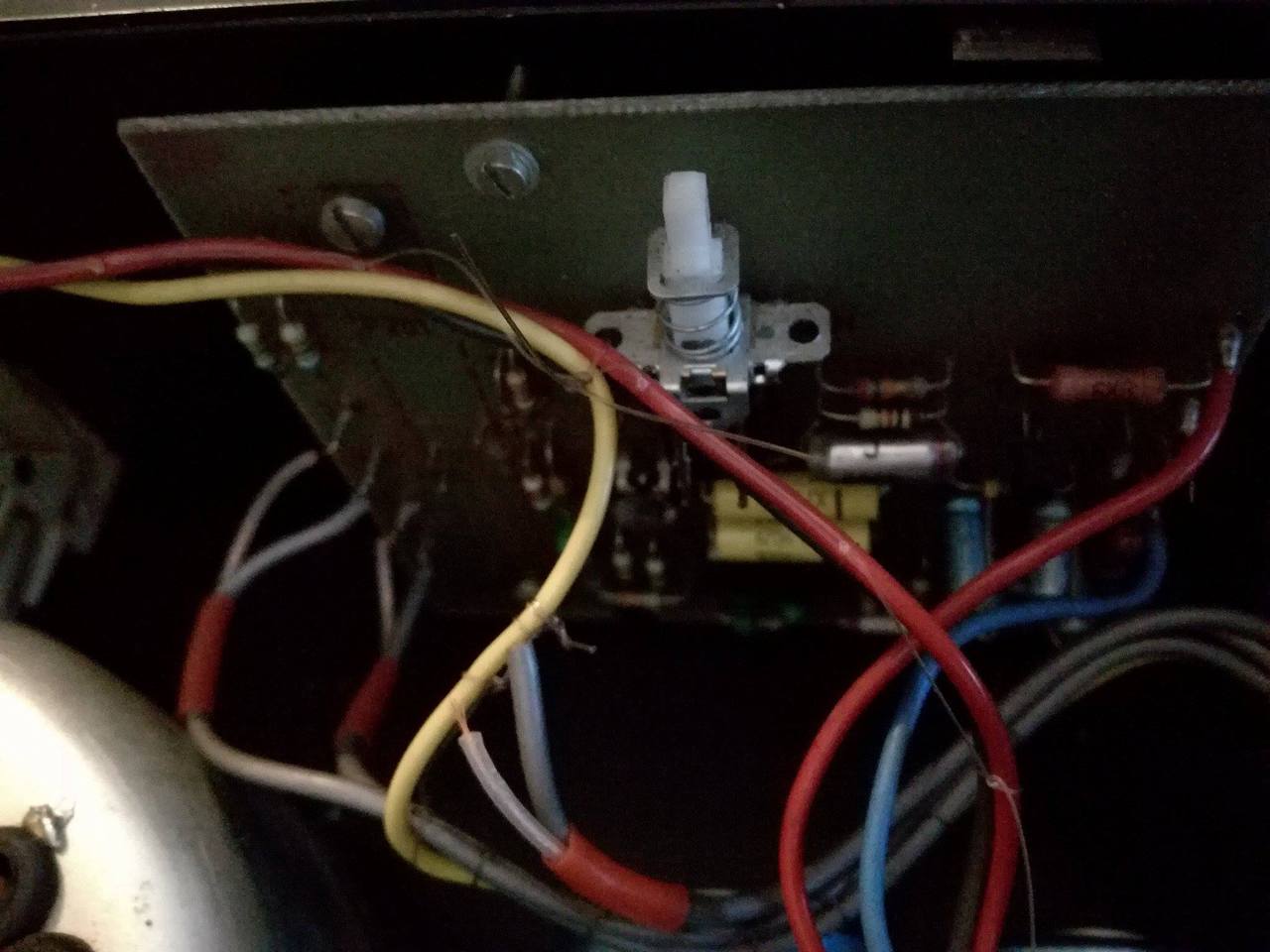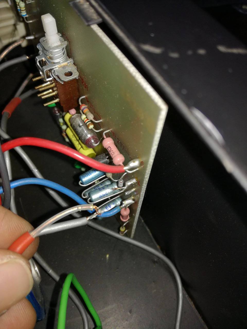 Kép a végfokról. Itt ugye a piros és a mellette lévő vékony sárga a jel,a nagyobb sárga a kimenet,a mellőle lejövő fekete megy a központi gnd-re. A fehér viszont nem tudom hova ment.