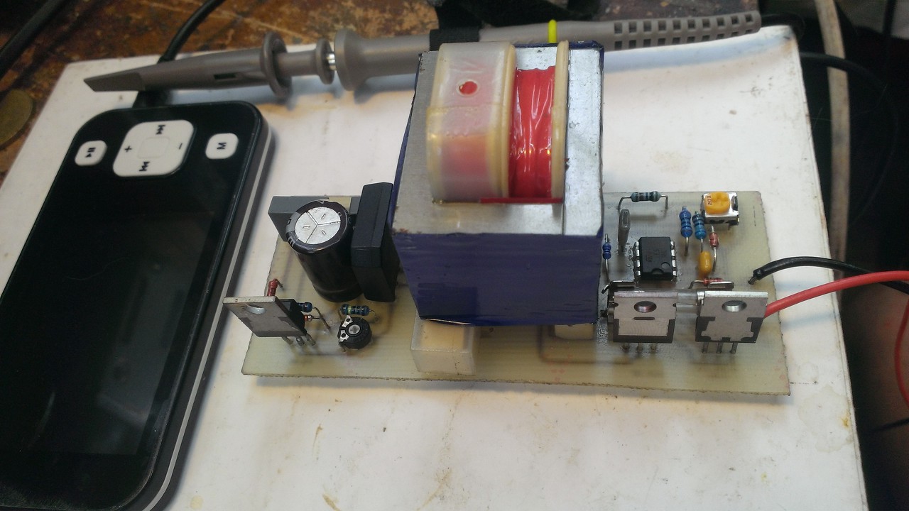 Megépítettem ezt az áramkört. Egy helyi elektronikai boltban kitben lehet kapni ugyanezt, megvettem és legalább nem kellett nyákot maratni. A különbség csak annyi, hogy a tranyó helyett IRF840 van és az 555 kb 50%-os 86Hz-re van beállítva (3k, 82k, 100n). Egy 2,4VA-es 12V-os nyáktrafó van benne. Az áramfelvétele 100 mA körüli, de csak 1u nagyfesz kondival sikerül beállítani 1 Hz körüli szikraimpulzusokat. Ha az itteni rajzon lévő 470 és 6k8 ellenállatokat rakom be, akkor 700 Hz körül hajtja meg a trafót, de így még lassabb és gyengébb a szikra és baromi lassan töltődik a kondi. Mit lehet tenni, hogy gyorsabban töltse a még nagyobb kondit?