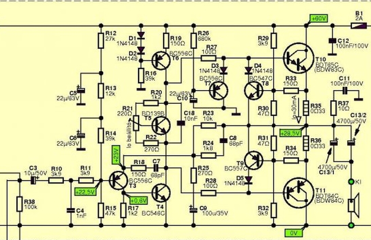 Tessék, kiollóztam. Én a mai napig ezt hallgatom, mert amellett hogy egyszerű a jóval drágább kategóriákban sem találtam nála jobb hangút. A tápfesszel úgy 35V-ig simán lemehetsz, csak a DC szintet kell beállítani R12 módosításával. Nyilván 15W-ra áramkorlát sem kell, tehát T8-T9 és a hozzájuk kapcsolódó alkatrészek elhagyhatók. Hangszóróvédelem sem kell mert azt megoldja a kimeneten lévő csatolókondi, a koppanásgátló szerepét pedig T7 látja el. Szóval egyszerű és nagyszerű.